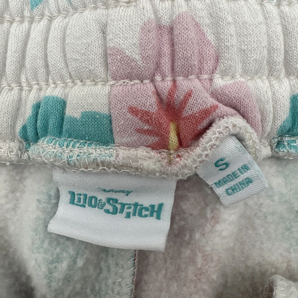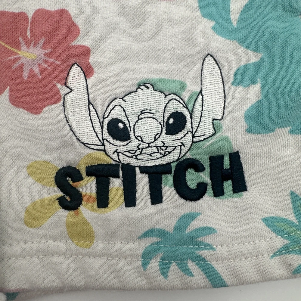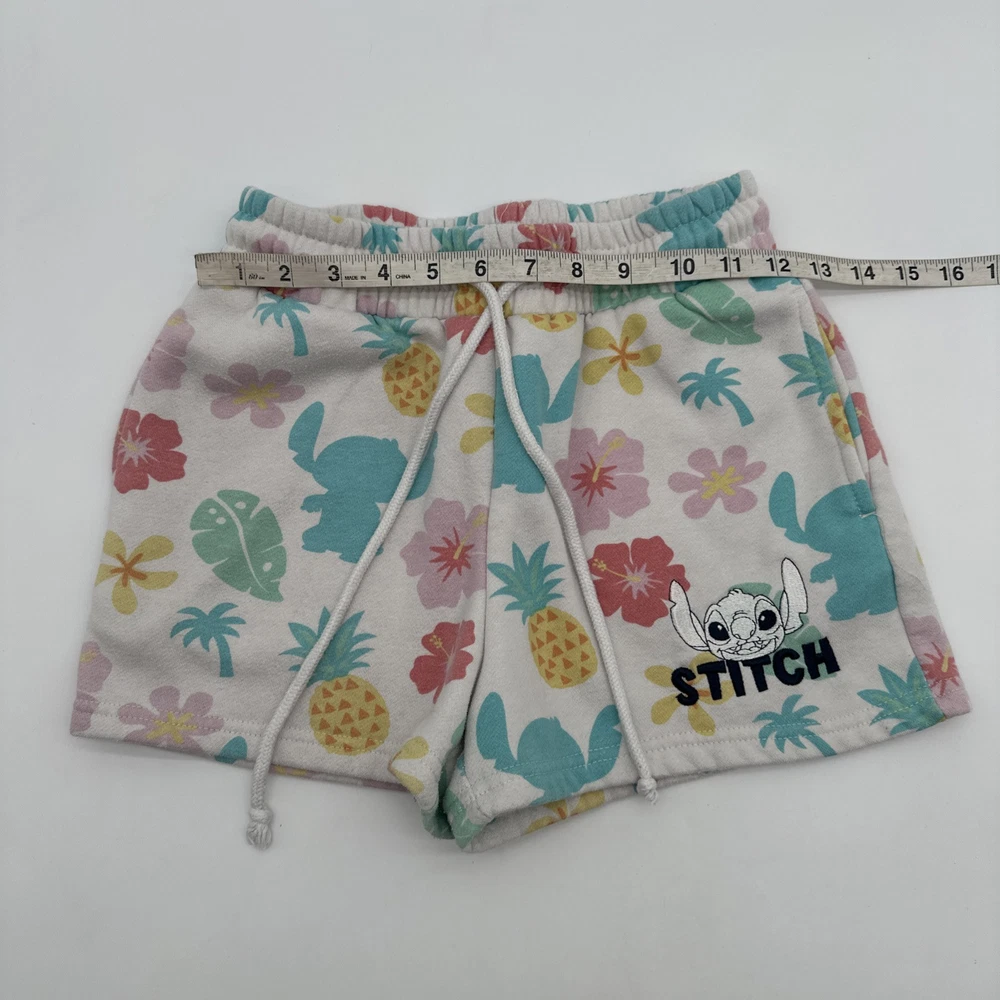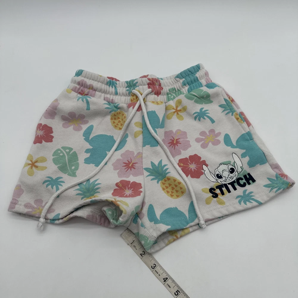 Women's Disney Lilo & Stitch shorts in size small, featuring a tropical all-over print with floral design. The shorts have a relaxed fit with a lace-up closure and pockets, including a coin pocket. Made of a light wash polyester and cotton blend fabric. Perfect for casual occasions in the summer or spring, ideal for walking or beach activities. Brand: Disney. Check pictures for flaws and measurements