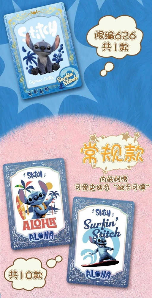 Disney Lilo & Stitch Embroidery Series - Cardfun Craft Trading Cards Features: Product Name: Disney Lilo & Stitch Trading Cards Characters: Lilo , Stitch , Nani , Dr. Jumba Jookiba , Agent Pleakley , Cobra Bubbles , The Grand Councilwoman Product Specifications: 1 card+1card brick/small box , 10 boxes/big box Main Material: Paper Shipping: Orders will be processed and shipped within 1-4 business days after payment is confirmed. International shipping times vary by destination, typically ranging from 7 to 20 business days. You can track the logistics online using the provided tracking number Returns: If a return or exchange is requested due to buyer's preference for unopened items, the buyer is responsible for all shipping costs involved. Once the original factory seal or sealed box is opened, the item is considered non-returnable unless there is a major printing or manufacturing defect. Returns due to quality issues will only be accepted after we receive the returned item and verify the defect