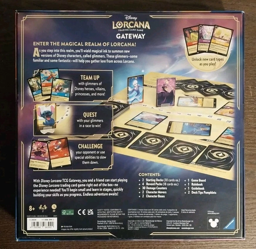 The Disney Lorcana TCG Shimmering Skies Set 5 - Gateway is a promotional box set released in 2024 by Ravensburger. This set includes 48 standard-sized cards featuring characters such as Elsa, Maleficent, Stitch, and Mickey Mouse. The cards are made of card stock, paper, and plastic, and are suitable for ages 8 and up. The set is part of the Disney Lorcana trading card game and includes a starter deck for players to begin their gameplay.