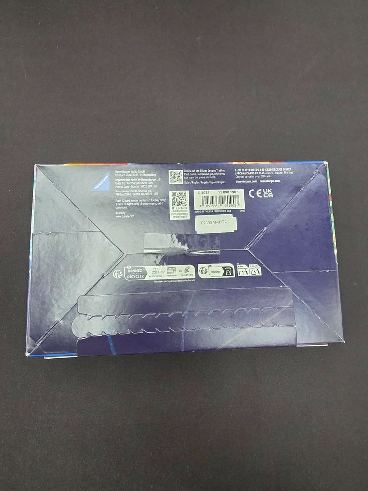 The Disney Lorcana: The First Chapter Booster Box contains 24 packs of standard-sized cards featuring popular characters from the Disney universe, such as Elsa, Maleficent, and Mickey Mouse. Each pack includes 12 cards made of durable card stock material. This booster box is part of the Disney Lorcana TCG set and includes promotional and first edition cards. The box is factory sealed and manufactured by Disney in the United States, making it a must-have for collectors and fans of Disney-themed card games. In hand, ships quickly and well protected. First Chapter Sealed and good condition Selling my batch of 1st Edition and modern cards, stay tunned for more! All sale are final!