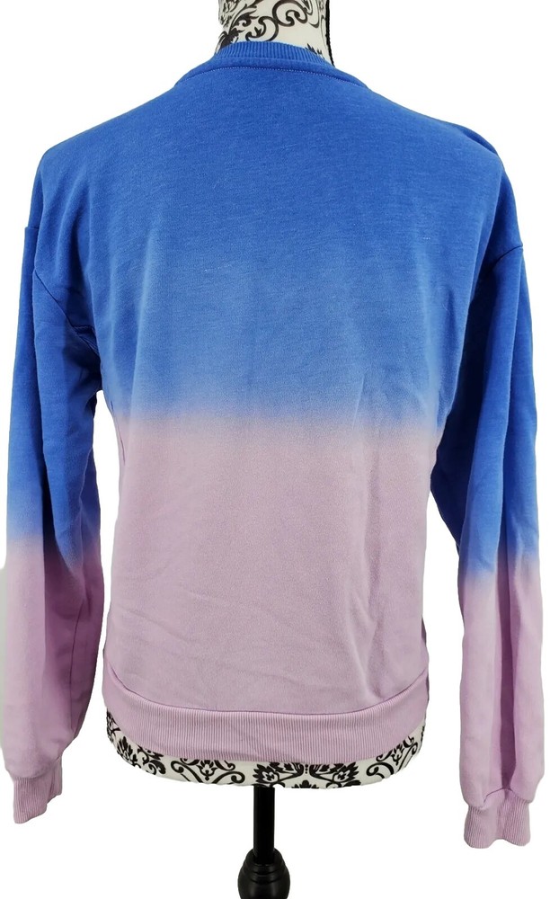 Disney Mickey Mouse Blue /Pink Ombre Cropped Women's Size Medium 7-9 Nice. It is made of 60% cotton and 40% polyester. Please check measurements as preowned item measurements may vary. The measurement across the chest laying flat is 20 inches and the length from the shoulder to the bottom is 20 1/2 inches.