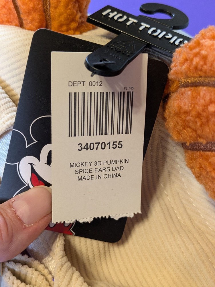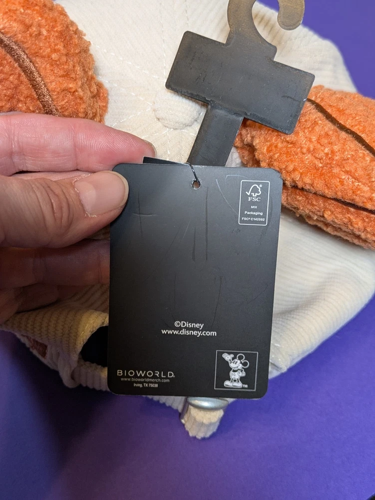 Item Specifics Condition: New with tags (NWT) Brand: Disney / Bioworld Style: Dad Hat / Baseball Cap Theme: Fall / Halloween / Pumpkin Spice Material: 100% Cotton Corduroy Color: Cream / Tan / Orange Size: Adjustable (One size fits most) Description New With Tags! Authentic Disney x Hot Topic Mickey Mouse Pumpkin Spice Dad Cap Celebrate the cozy vibes of fall with this adorable Mickey Mouse corduroy hat! This is the perfect accessory for Disney Parks trips, pumpkin patch outings, or just enjoying your favorite PSL. Key Features: Premium Material: Soft, cream-colored cotton corduroy body that feels great and looks perfect for autumn. Iconic Details: Features a centered Mickey Mouse Pumpkin Spice Latte (PSL) embroidered patch. 3D Elements: Topped with two fuzzy, plush 3D Mickey ears designed to look like mini pumpkins. Back Embroidery: Beautifully detailed embroidered autumn leaves and an acorn on the back for an extra touch of seasonal charm. Adjustable Fit: Includes a metal slider buckle at the back to ensure a comfortable, custom fit for most adults. Condition: Brand new with original Hot Topic tags still attached. Ships in a box to ensure the 3D ears arrive in perfect shape!