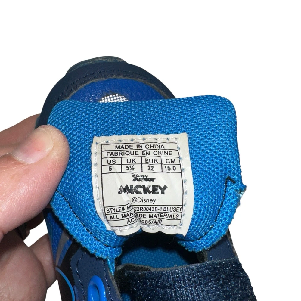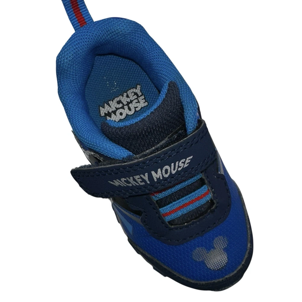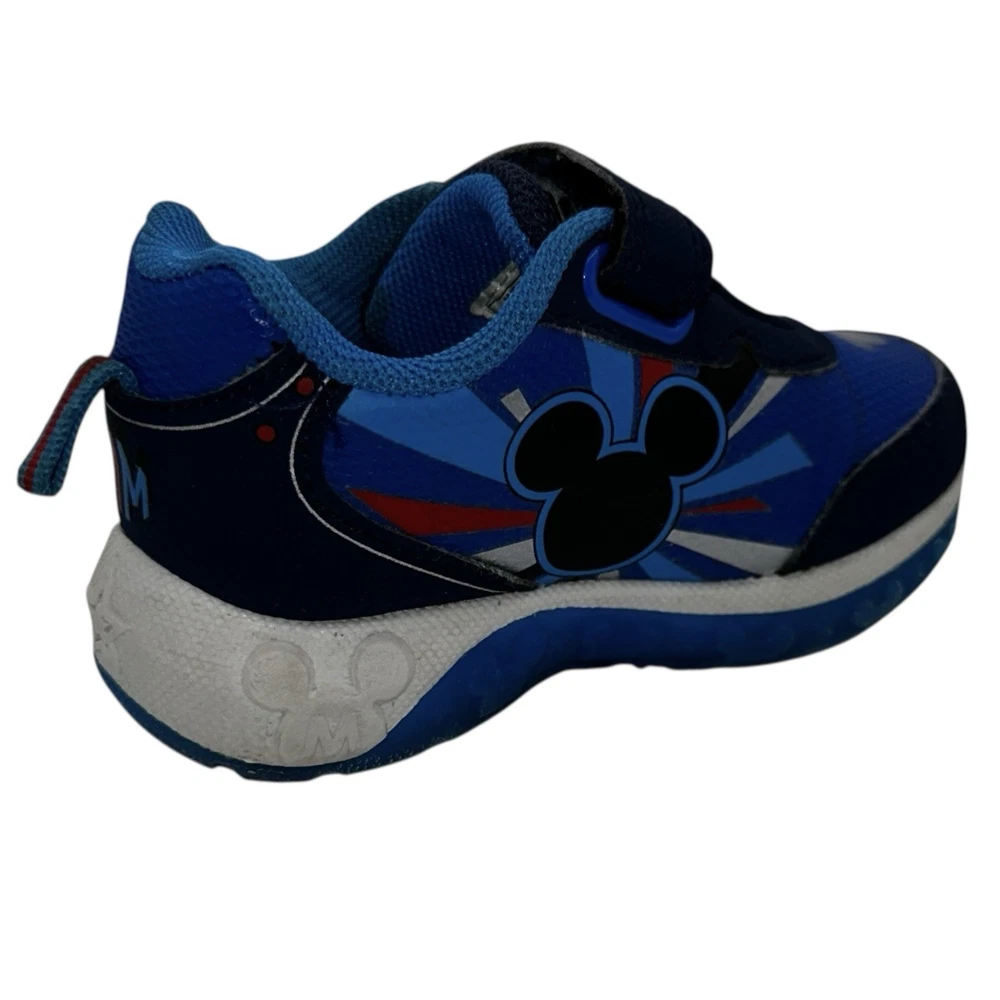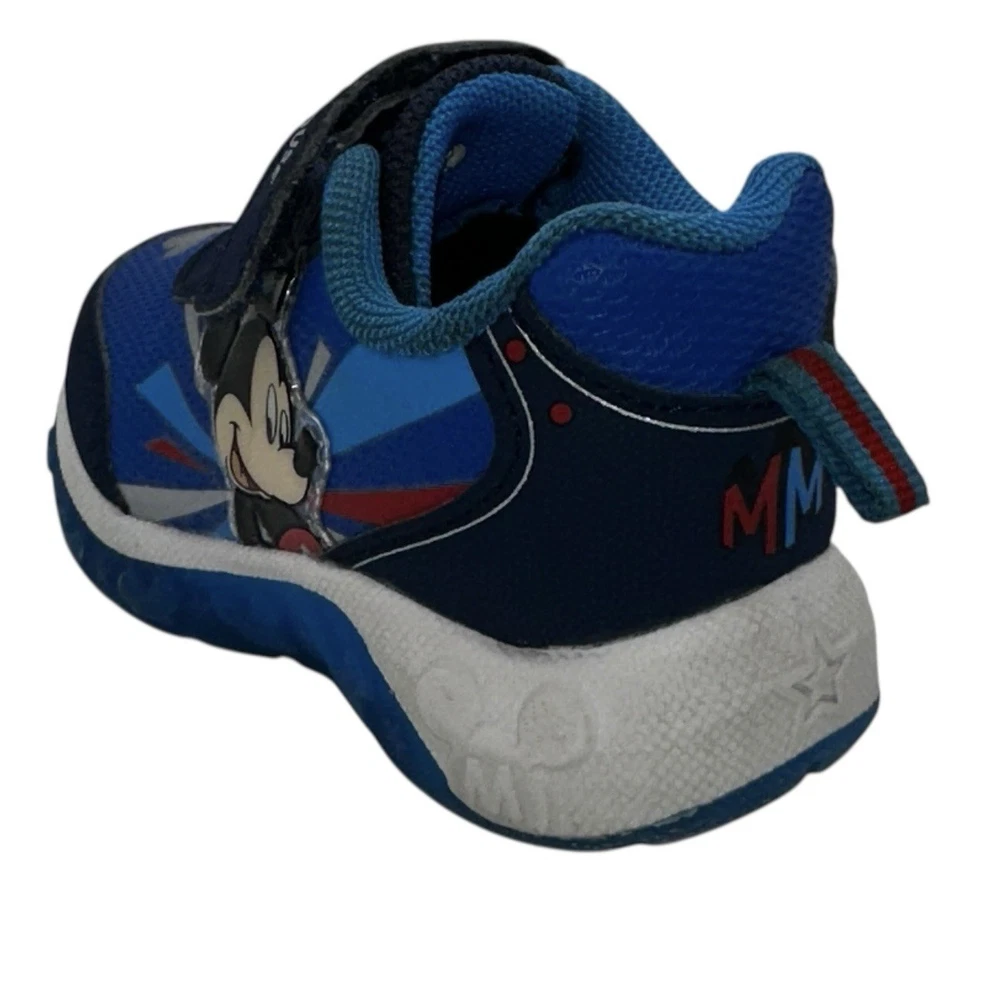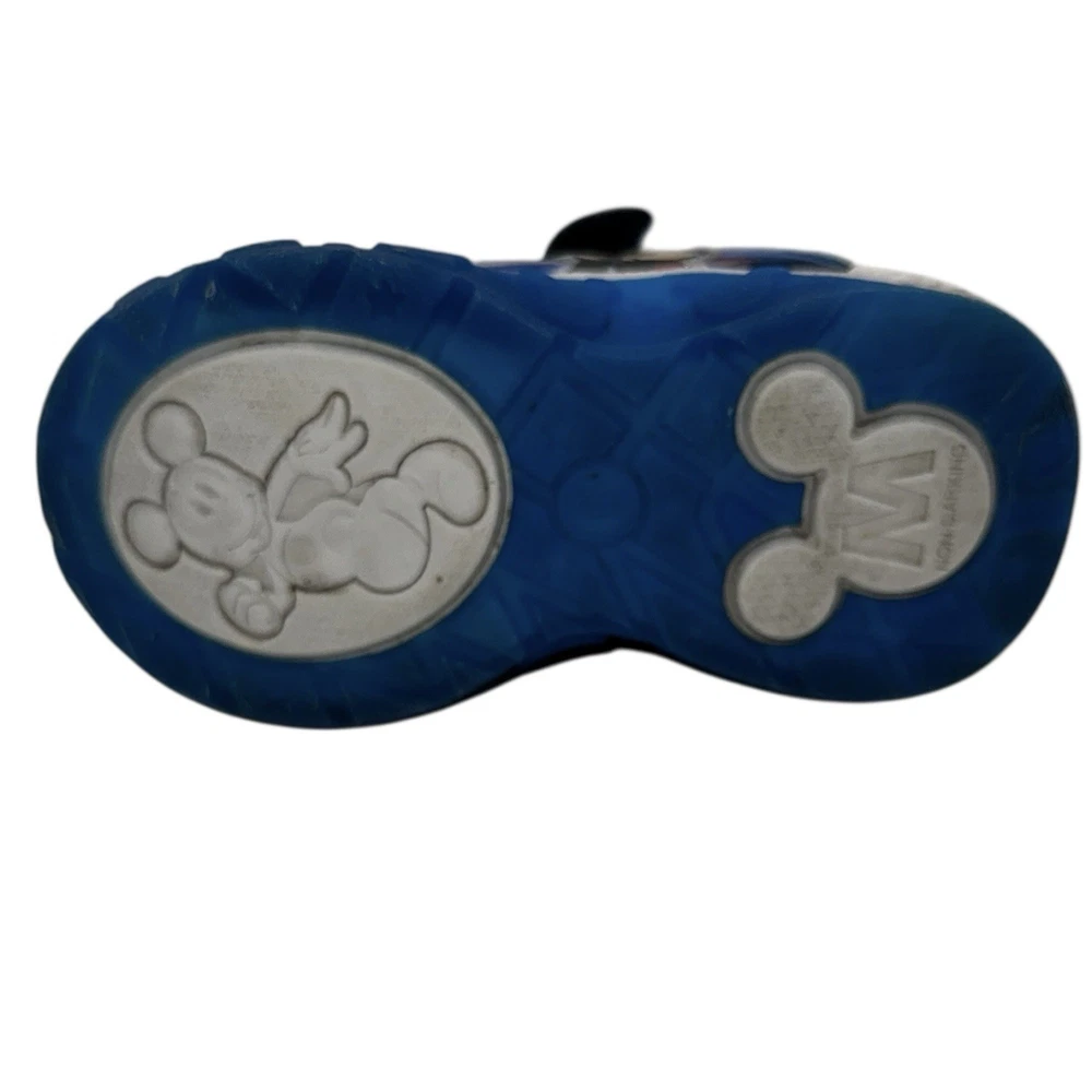 These Disney Mickey Mouse toddler sneakers in size 6 are a stylish and fun choice for young boys. The shoes feature a blue color with a Mickey Mouse character design, making them perfect for fans of the beloved Disney character. The light-up feature adds an extra element of whimsy, while the hook & loop closure ensures a secure fit. These athletic sneakers are sure to make any toddler feel like a superstar with their cool design and functional lights.