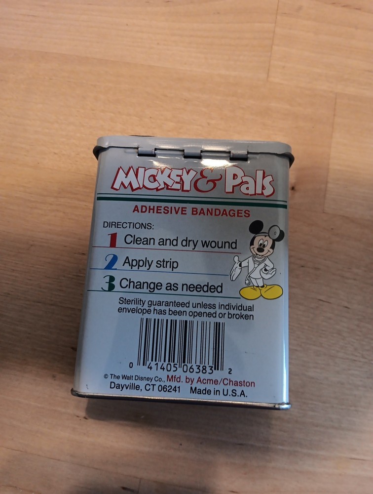 The product is a set of Mickey and Pals adhesive bandages featuring the character Donald Duck from Disney. The bandages come in a metal tin, making them a convenient and collectible item for fans of Disneyana and Mickey Mouse. With the brand being Disney, these bandages are sure to have a touch of nostalgia and whimsy for collectors and enthusiasts of the franchise. TIN IS EMPTY