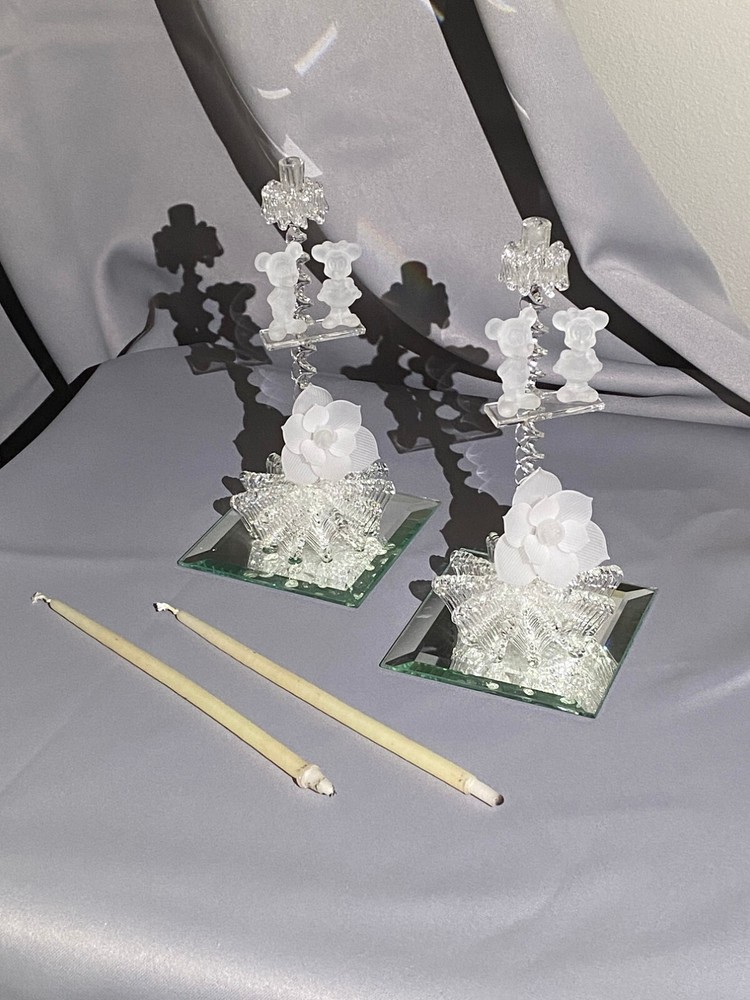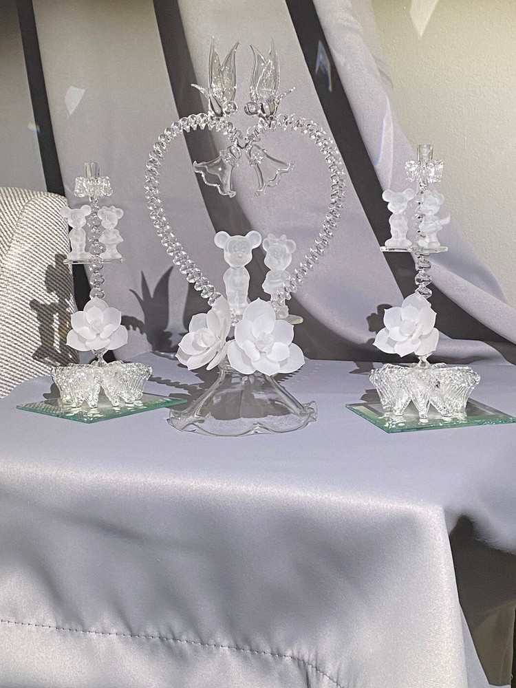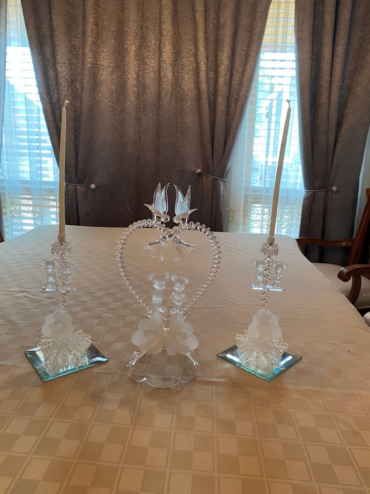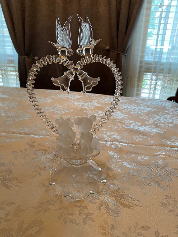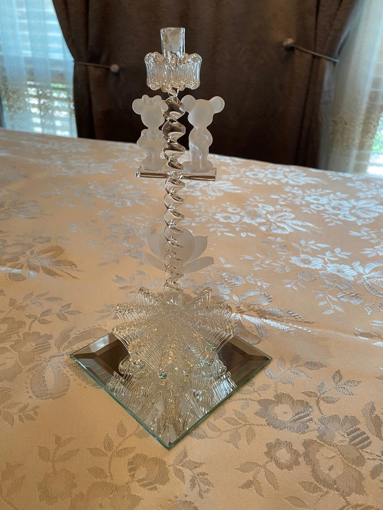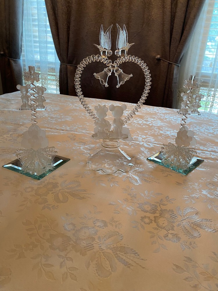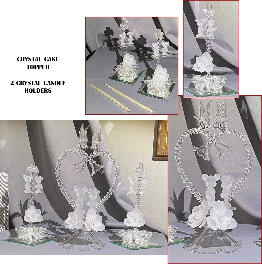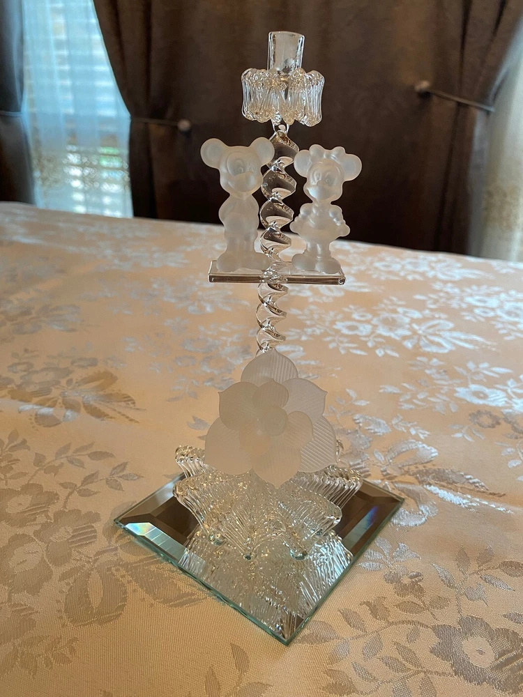 You will love this extremely rare Disney Mickey/Minnie Mouse spun glass wedding cake topper set which includes matching candle holders on a mirror base and tapered white candles, perfect for celebrating a wedding or anniversary. The cake topper features Mickey and Minnie Mouse, a couple of beloved characters from the Disney franchise, and stands at a height of 11-3/4 inches and is 6-1/4 inches at it's widest point. The base measures a diameter of 5 inches. The candle holders are 8-1/2 inches tall without the candles, the white candles (included) are 8 inches tall, and the mirrored base measures 4 inches square. The cake topper is adorned with two flowers at the bottom and two bells and two birds on the top. The candle-holder features a spun glass bottom on a mirror base and is also adorned by one flower and the adorable Mickey/Minnie Mouse pair. Created by the talented artists at the Disneyland glass blower gift shop in Anaheim, California, USA in 1997, this exquisite collectible set is a nostalgic and charming addition to any Disney lover's collection. This set (Mickey/Minnie Mouse topper, candle holders, and white candles) is preowned and has never been used.