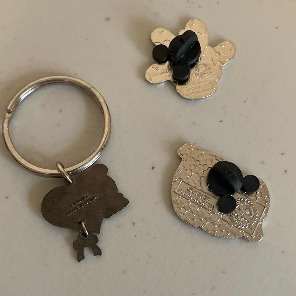 Lot of 3 Minnie Mouse keychain Minnie Mouse pin (# 5 of 8 in the Hidden Mickey white glove silhouette 2013 collection) Minnie Mouse shoes Official trading pin All in very good used condition