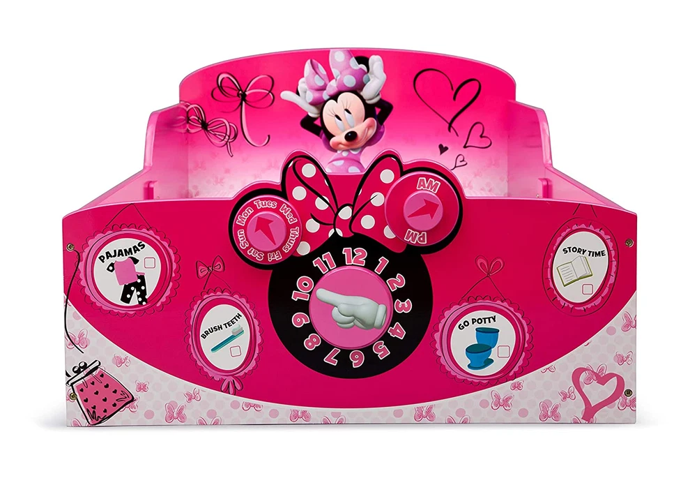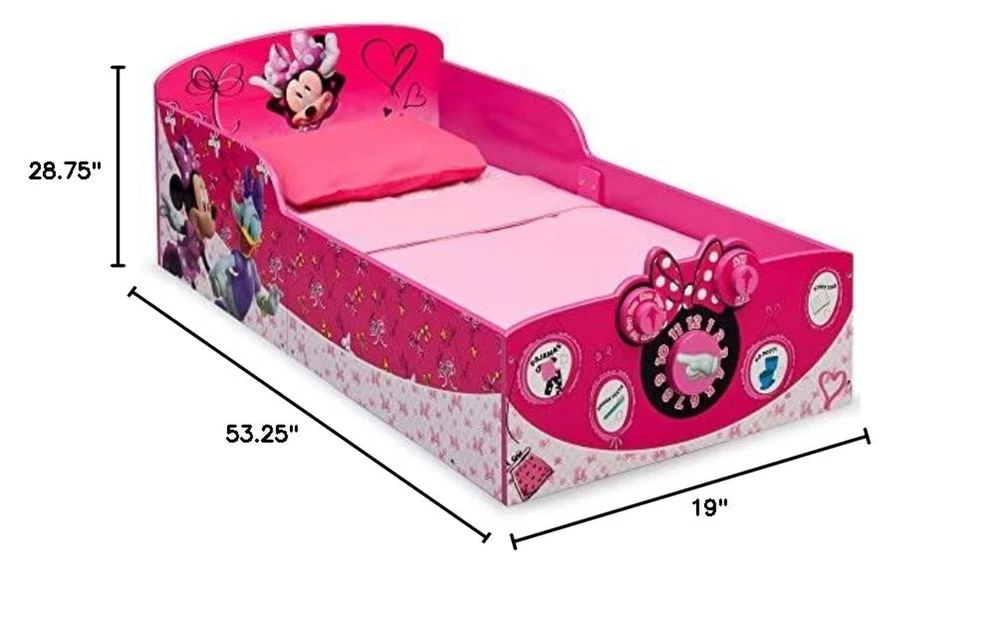Disney Minnie Mouse Interactive Wood Toddler Bed New Gift Kid's Furniture Recommended for ages 15 months+ Made of strong and sturdy wood Bedtime checklist on the footboard easily wipes clean; dry-erase marker not included Interactive clock with day of the week spinner helps make learning the days and time telling fun Assembled dimensions: 53.25"L x 28.75"W x 19"H Easy assembly What will your little one love most about this Minnie Interactive Wood Toddler Bed from Delta Children? Will it be the colorful Disney graphics that inspire any mini mouseketeer? Or will it be the before bed checklist and movable clock at the footboard? Actually, we think she'll love it all! And parents will love the sturdy wood construction with elevated sides and low to the ground design that helps create the big-kid room of her dreams.