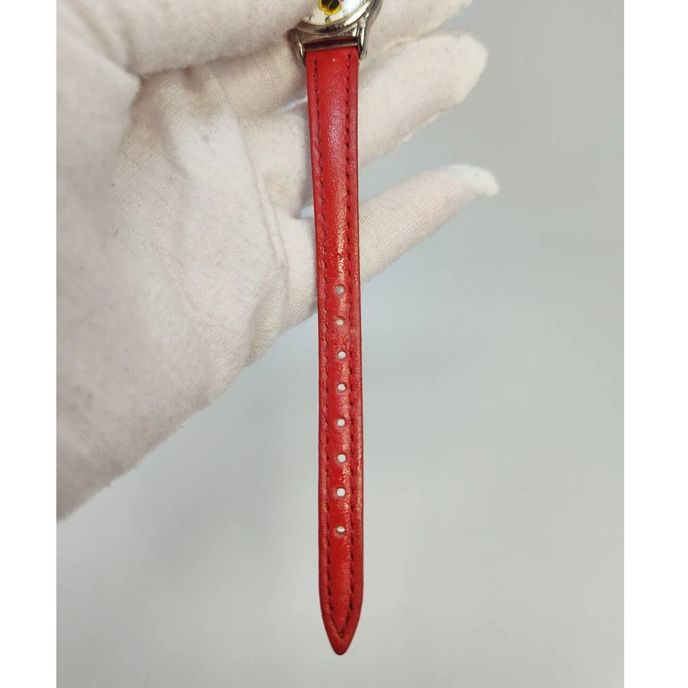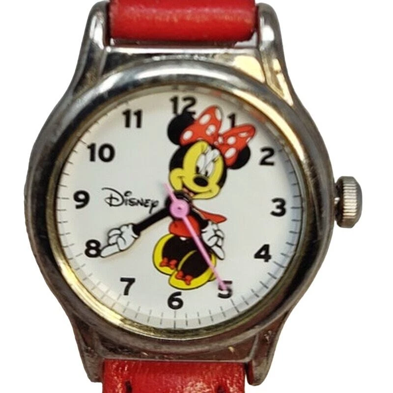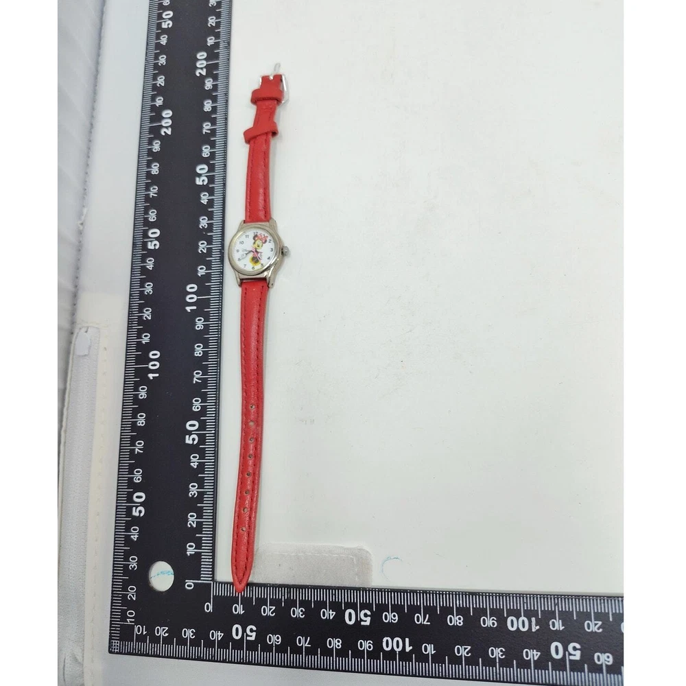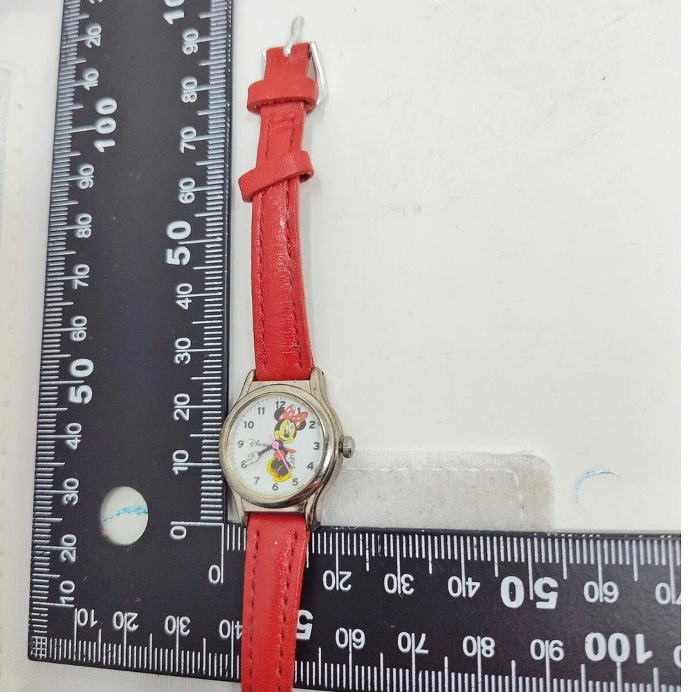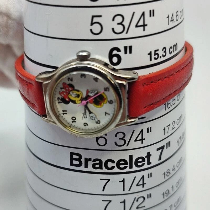 Add a touch of Disney magic to your style with this charming Minnie Mouse analog watch. Featuring Minnie in her classic red and white polka dot dress, her hands make up the clock hands, adding a playful twist to the design. The small silver-toned round face against a white background beautifully showcases Minnie's iconic look. Complemented by a red leather band, this watch exudes elegance and whimsy. Perfect for Disney fans and collectors, this authentic Minnie Mouse watch brings the beloved character to life on your wrist. Add this delightful and iconic accessory to your collection today! Size: Measurements photographed are in Millimeters Condition: well worn The battery has been freshly installed and the watch is ticking, but it has not been evaluated for accuracy. Have a magical day Cat-friendly, smoke-free home.