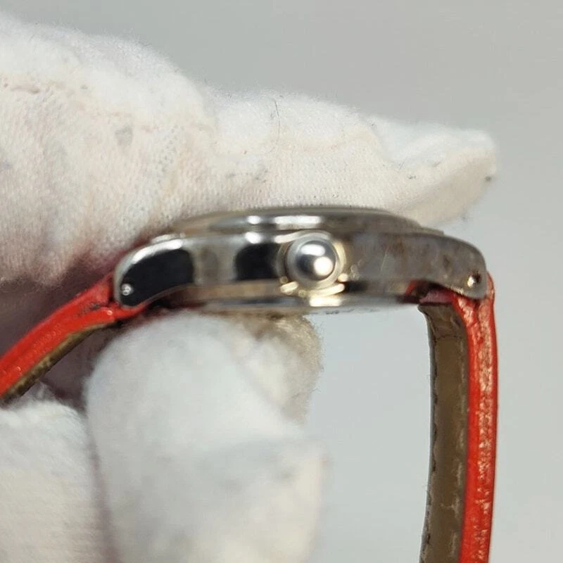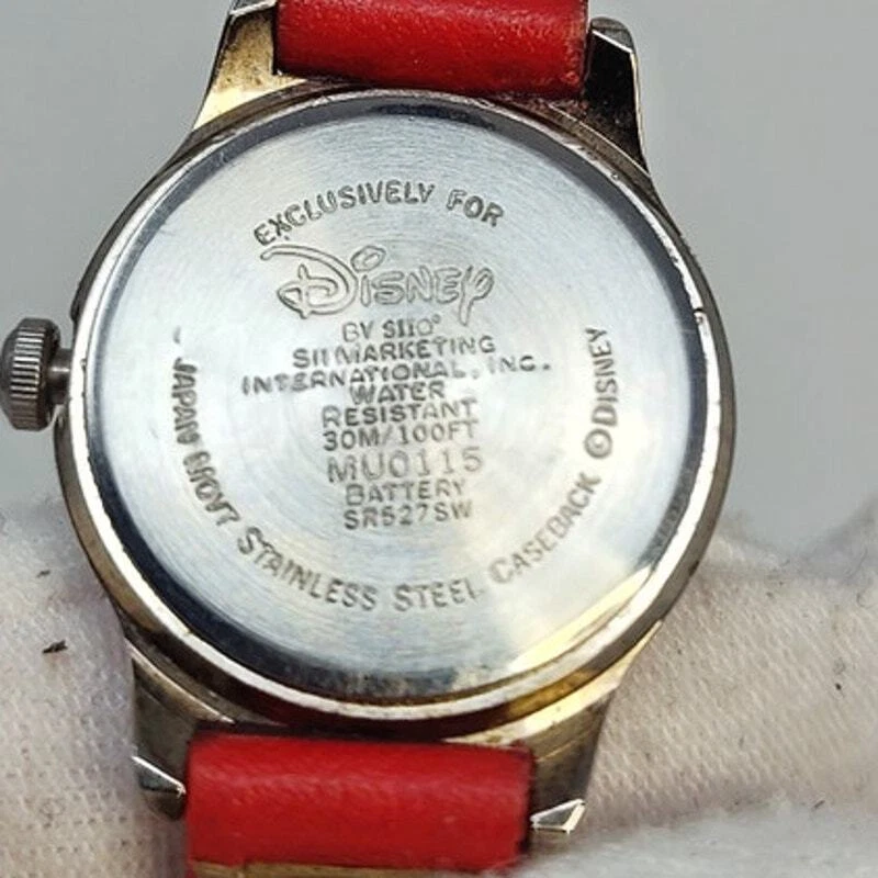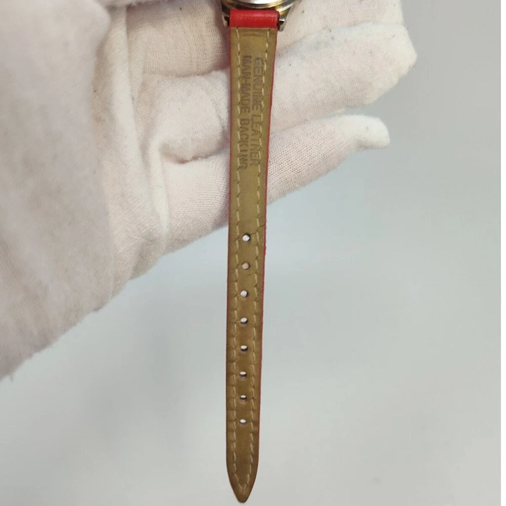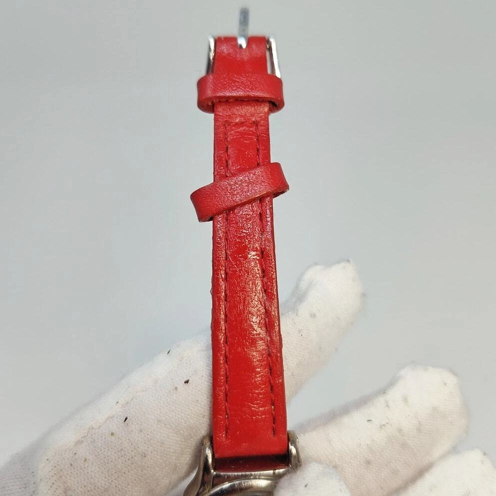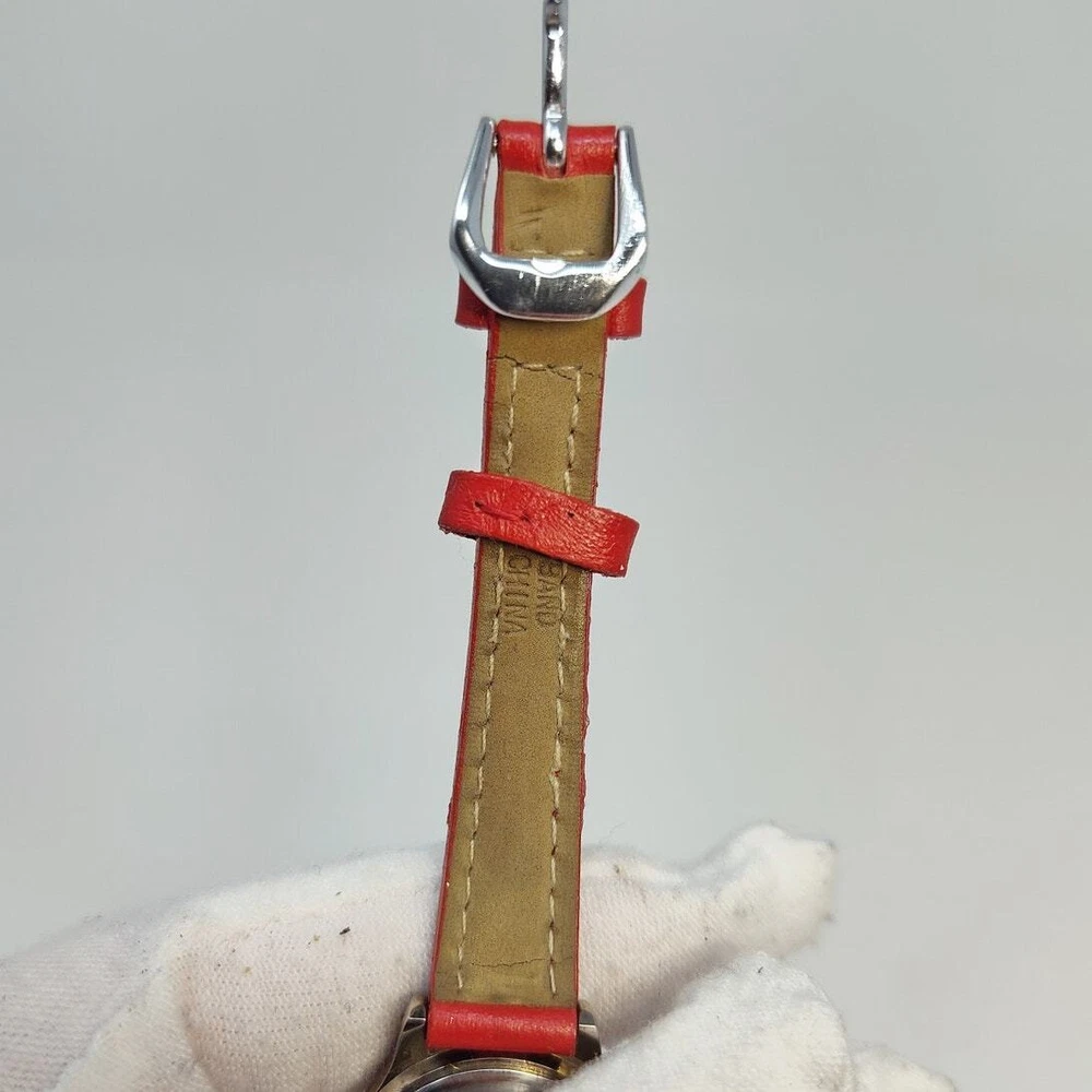 Add a touch of Disney magic to your style with this charming Minnie Mouse analog watch. Featuring Minnie in her classic red and white polka dot dress, her hands make up the clock hands, adding a playful twist to the design. The small silver-toned round face against a white background beautifully showcases Minnie's iconic look. Complemented by a red leather band, this watch exudes elegance and whimsy. Perfect for Disney fans and collectors, this authentic Minnie Mouse watch brings the beloved character to life on your wrist. Add this delightful and iconic accessory to your collection today! Size: Measurements photographed are in Millimeters Condition: well worn The battery has been freshly installed and the watch is ticking, but it has not been evaluated for accuracy. Have a magical day Cat-friendly, smoke-free home.