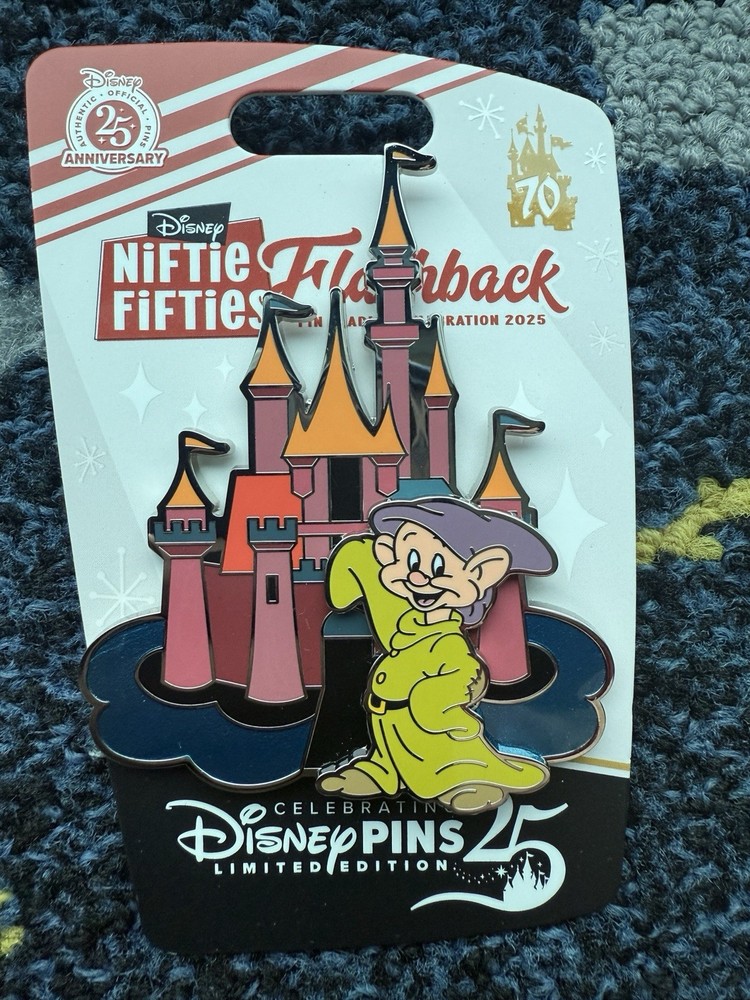 Theme: Niftie Fifties Event Franchise: Disney Features: Exclusive, Pin on Pin Brand: Disney Character/Story/Theme: Dopey Type: Single Year: 2025