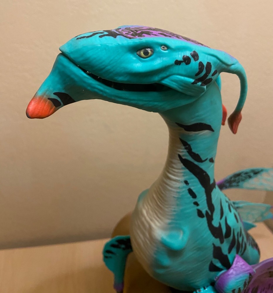 TAKES TWO AAA (Triple A) Batteries. SEE PHOTO FOR LOCATION of ON & Off Switch which you must remove or move or slide magnet & is located above belly & is a little hidden under silicone skin: Again see photo for location. SEE VIDEO Disney Pandora Avatar ACE Banshee Rookery Dragon…Blue, Turquoise, Black, Purple, orange with yellow eyes, Interactive Puppet with Magnet Excellent Used Condition!! WORKS GREAT!! SEE VIDEO Buyer pays estimated calculated shipping & handling