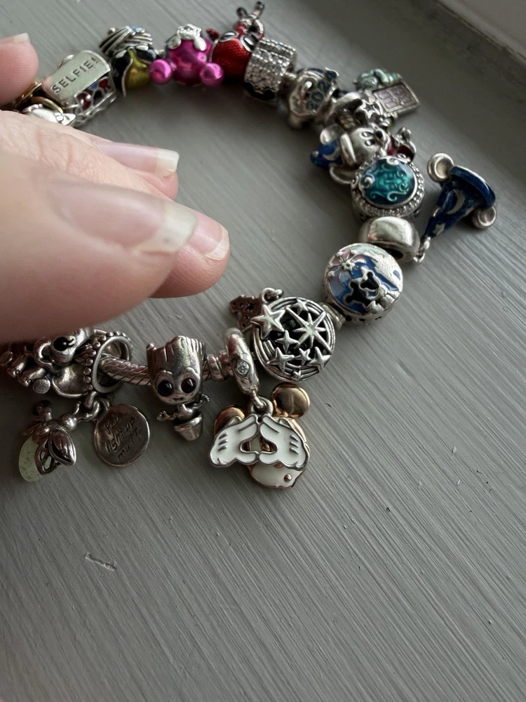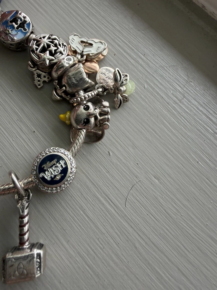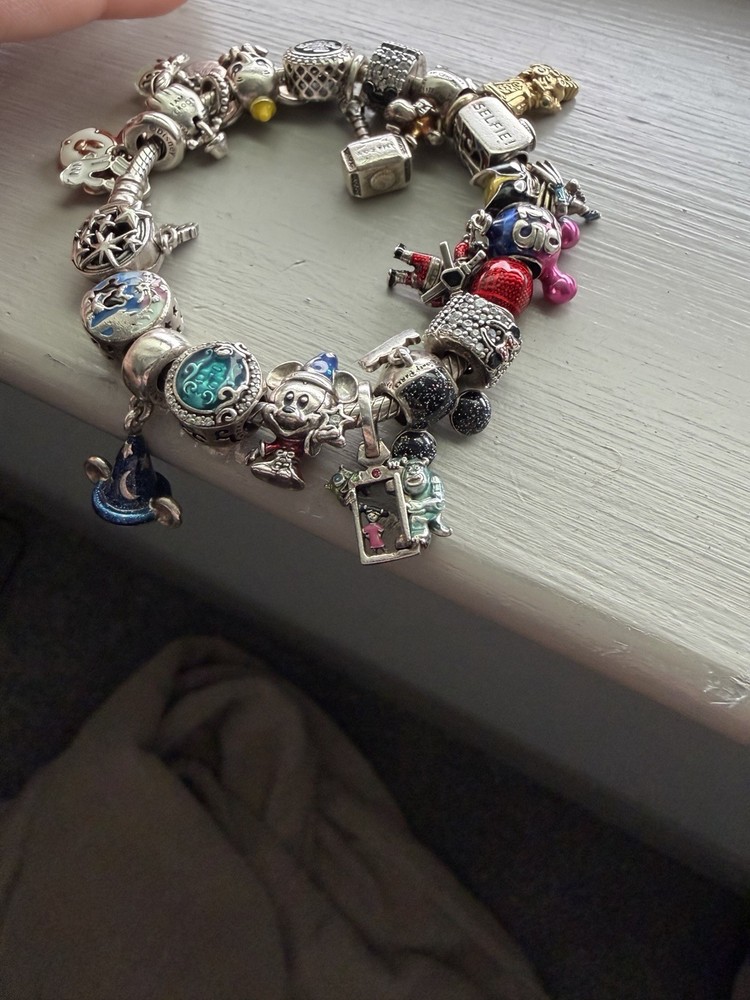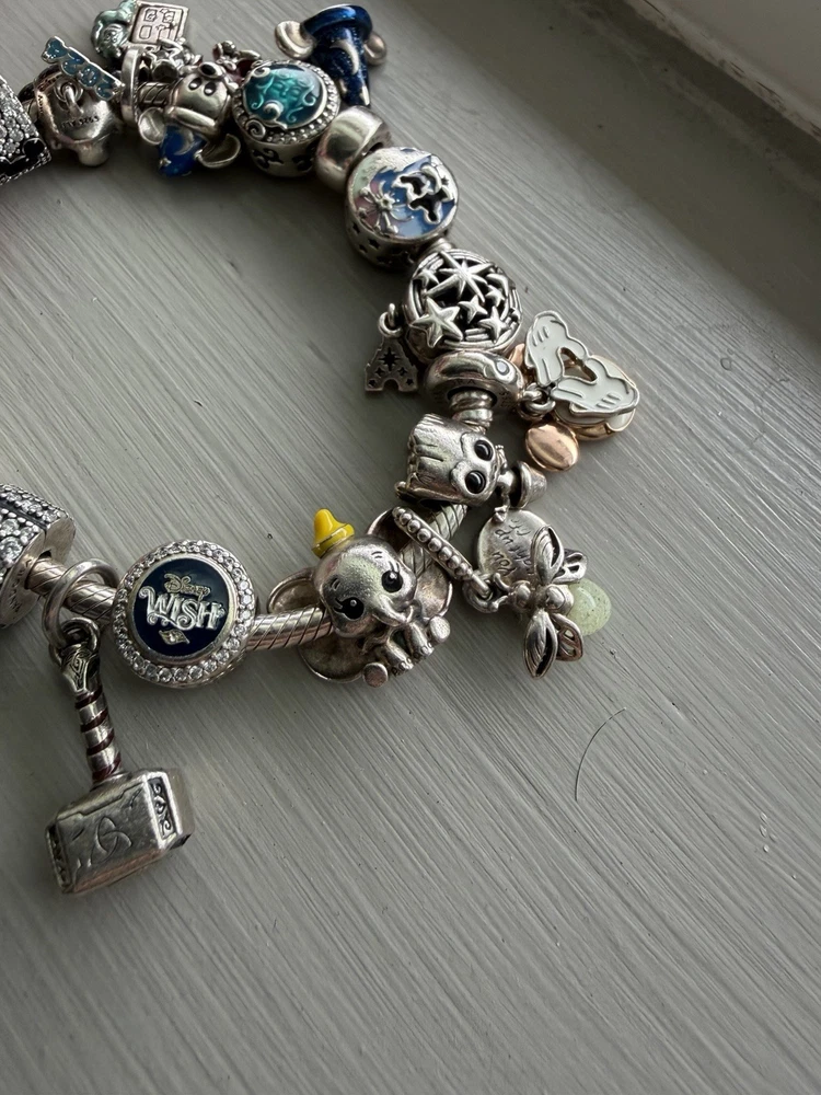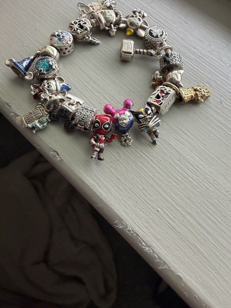 Fully charmed pandora bracelet. Has many different marvel characters, haunted mansion charm, Disney charms as well.