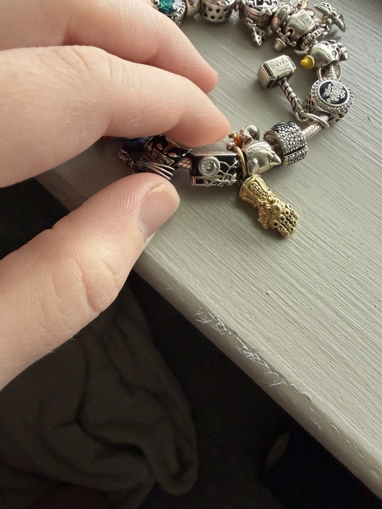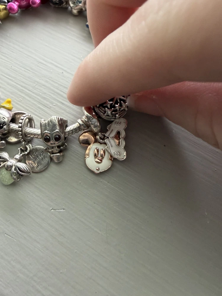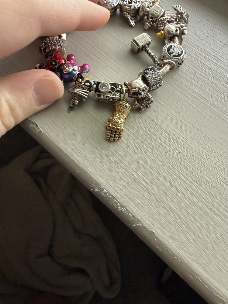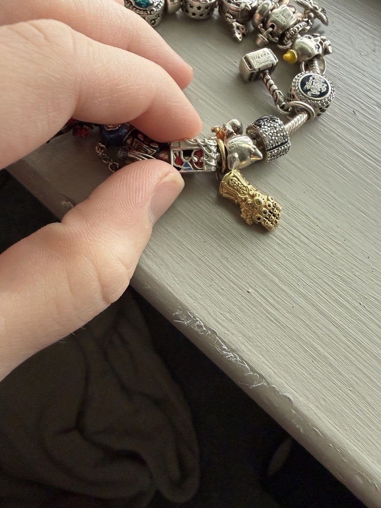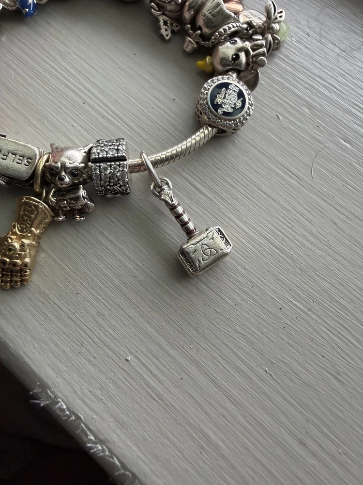 Fully charmed pandora bracelet. Has many different marvel characters, haunted mansion charm, Disney charms as well.