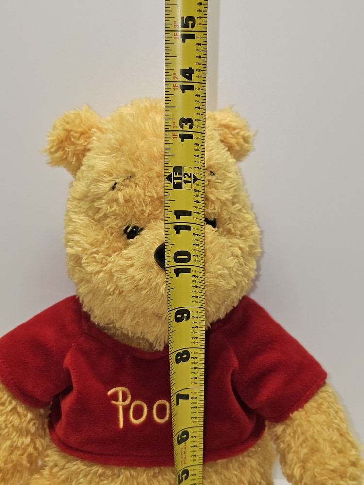 This adorable 14-inch Winnie the Pooh plush is an official Disney Parks collectible, sold at Disneyland and Walt Disney World. Pooh features soft, fuzzy golden fur, a red velvety "Pooh" shirt, and classic embroidered facial details. Brand: Disney Theme Park Merchandise Character: Winnie the Pooh Height: Approx. 14 inches Material: Polyester Fiber & Polyurethane Foam Tag Info: Marked with Disney Parks, Disneyland/Walt Disney World label Color: Yellow with red shirt Condition: Pre-owned in very good condition. There are a few light scuffs on the plastic nose (see close-up photo), but the plush is clean with no holes or stains. Original tag still attached.