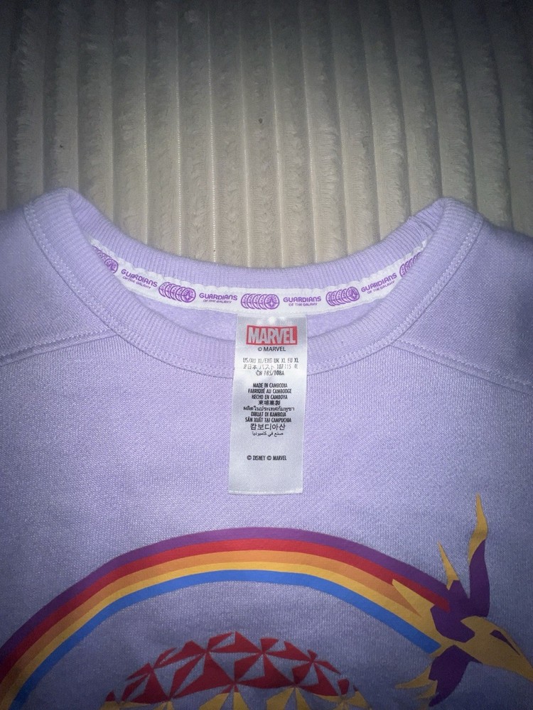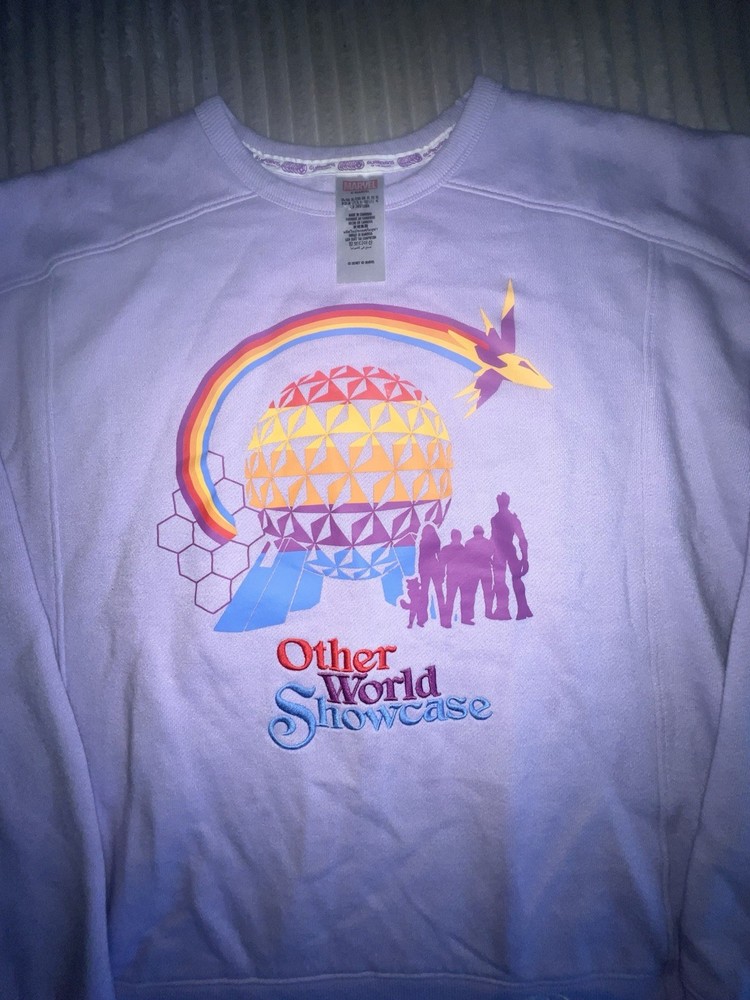 The product is a Disney Parks 2024 Other World Show Case Sweatshirt featuring Epcot and Guardians of Galaxy characters. This collectible item is part of the Disney franchise and is likely to be a sought-after souvenir for fans of Disney theme parks. With its unique design and tie-in to popular Disney properties, this sweatshirt would be a valuable addition to any Disney collection.