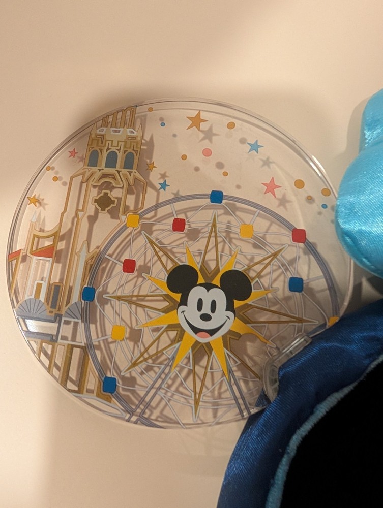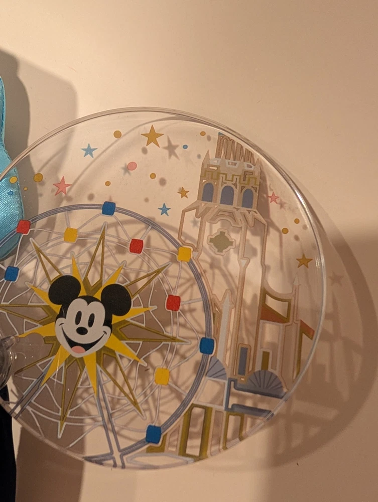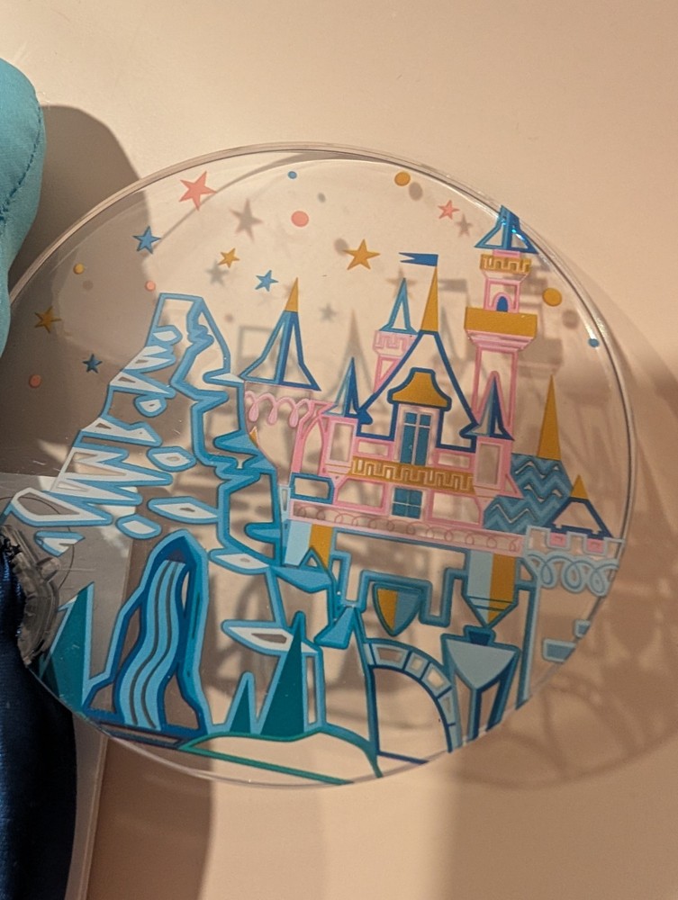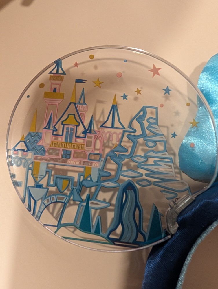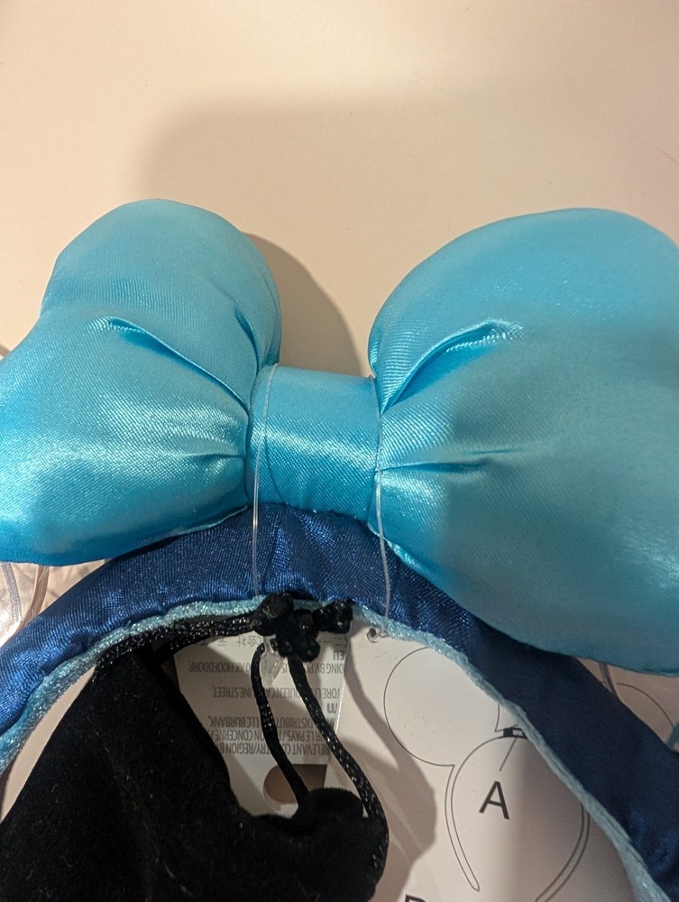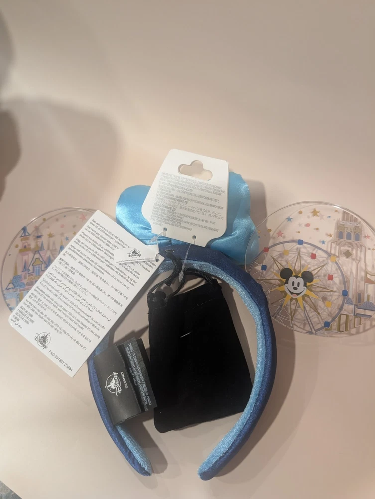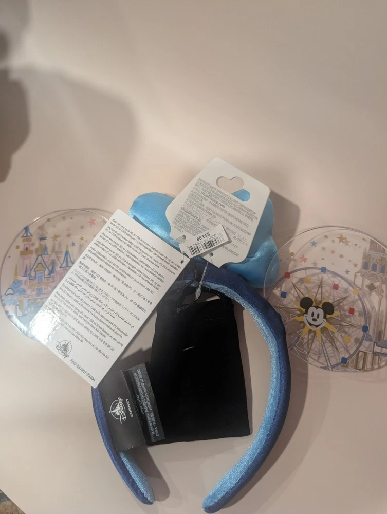 Brand new with tags! This acrylic ear headband features two clear ears with colorful designs of Disneyland Resort icons on either ear. A silky blue bow is attached at the center, and matches the headband’s velour interior. The exterior of the headband is lined with a darker blue velour. The left ear features Carthay Circle Restaurant and the Pixar Pal-A-Round from Disney California Adventure. Each icon is depicted in colorful line art. The other ear features art of Matterhorn Bobsleds and Sleeping Beauty Castle from Disneyland Park. Tiny sparkles and stars in blue, pink, and gold are scattered in the “sky” on both ears. A USB-C charging port is on the back of the headband, so users can recharge the battery after use. Charging instructions are included on a tag attached to the headband. Ships quickly and with care from a smoke-free pet-friendly home. Have questions, please ask. I respond quickly. Thank you!
