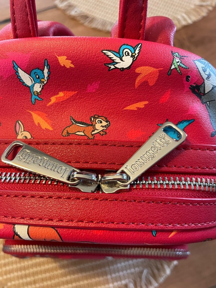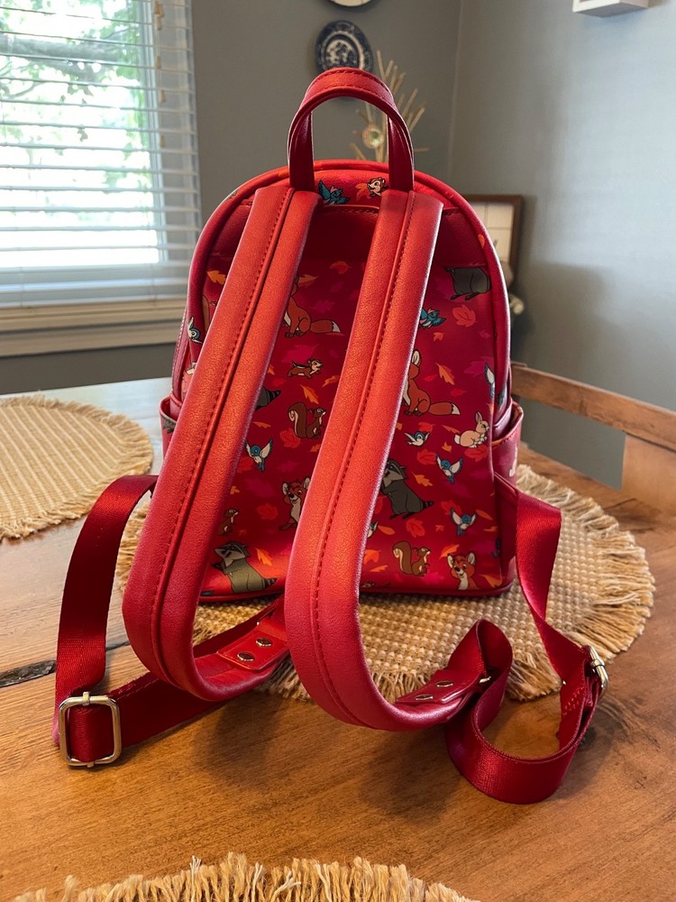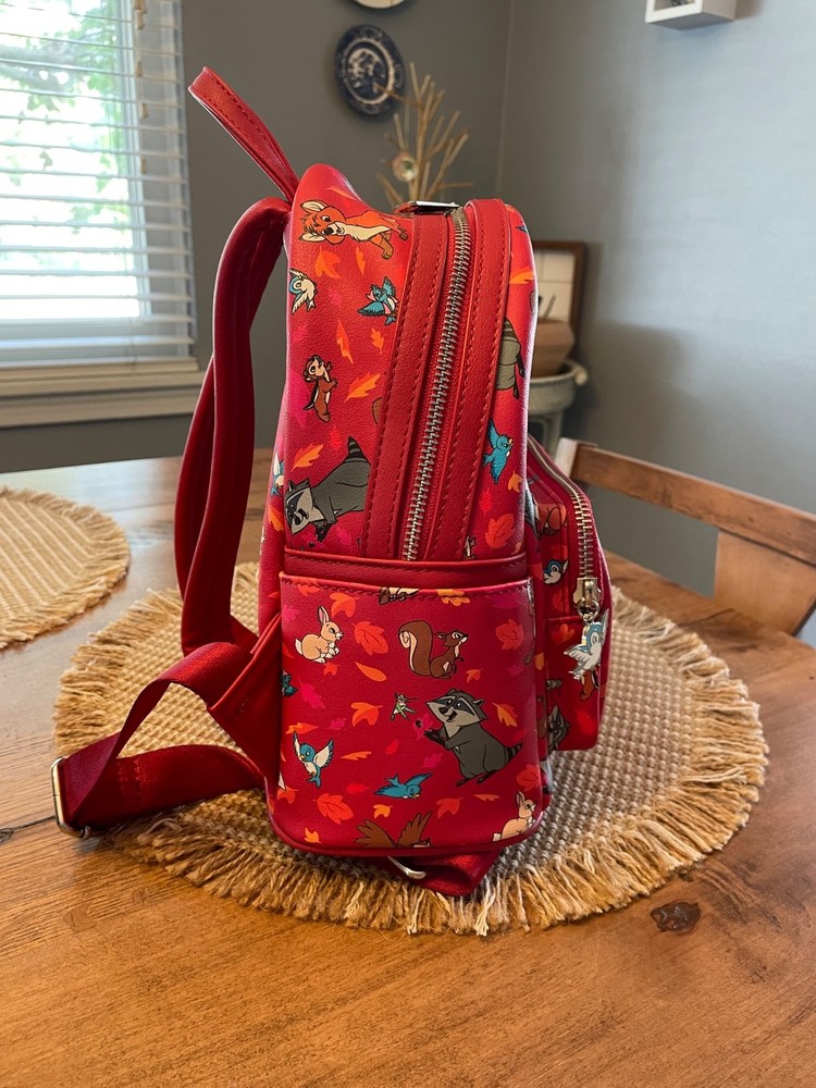 The Disney Parks Loungefly mini backpack in the critters forest friends design features a playful red color and adorable woodland animal motifs, perfect for fans of the Disney franchise. This small-sized backpack is ideal for carrying essentials while showcasing a love for Disney and its lovable characters. The Loungefly brand adds a contemporary touch to this collectible piece, making it a must-have for Disney enthusiasts looking to add a touch of whimsy to their everyday wardrobe.