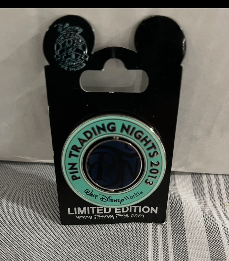 WDW Disney Pin Trading Night 2013 featuring a Hitch Hiking Ghost, Ezra. The pin is circular and is Light Blue. "Pin Trading Nights 2013" is written in darker blue along with "Walt Disney World®". On the back of the pin it has "PTN" in dark blue. Hitch Hiking Ghost is shown on other side of spinner. According to the official DisneyParksMerchandise.com page this pin will be released at the October 22, 2013 Trading Night at the ESPN Wide World of Sports Complex. Haunted Mansion