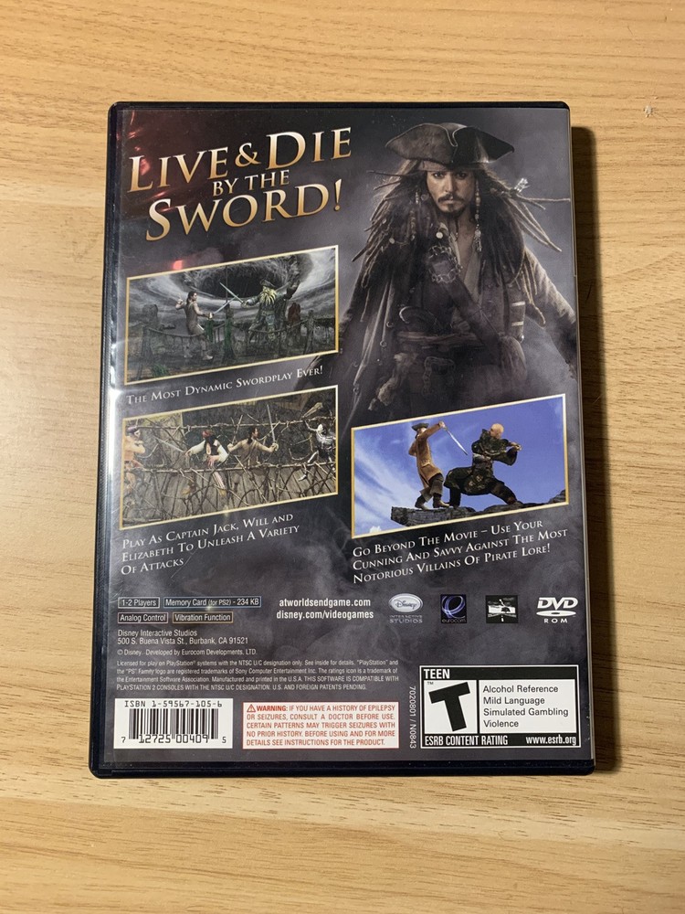 Rating:T-TeenPlatform:Sony PlayStation 2Publisher:DisneyVideo Game Series:Disney Pirates Of The CaribbeanUPC:712725004095Genre:Action & Adventure, Hack and SlashFeatures:Manual IncludedRegion Code:NTSC-U/C (US/Canada)gtin13:712725004095Game Name:Disney Pirates Of The Caribbean At World's End