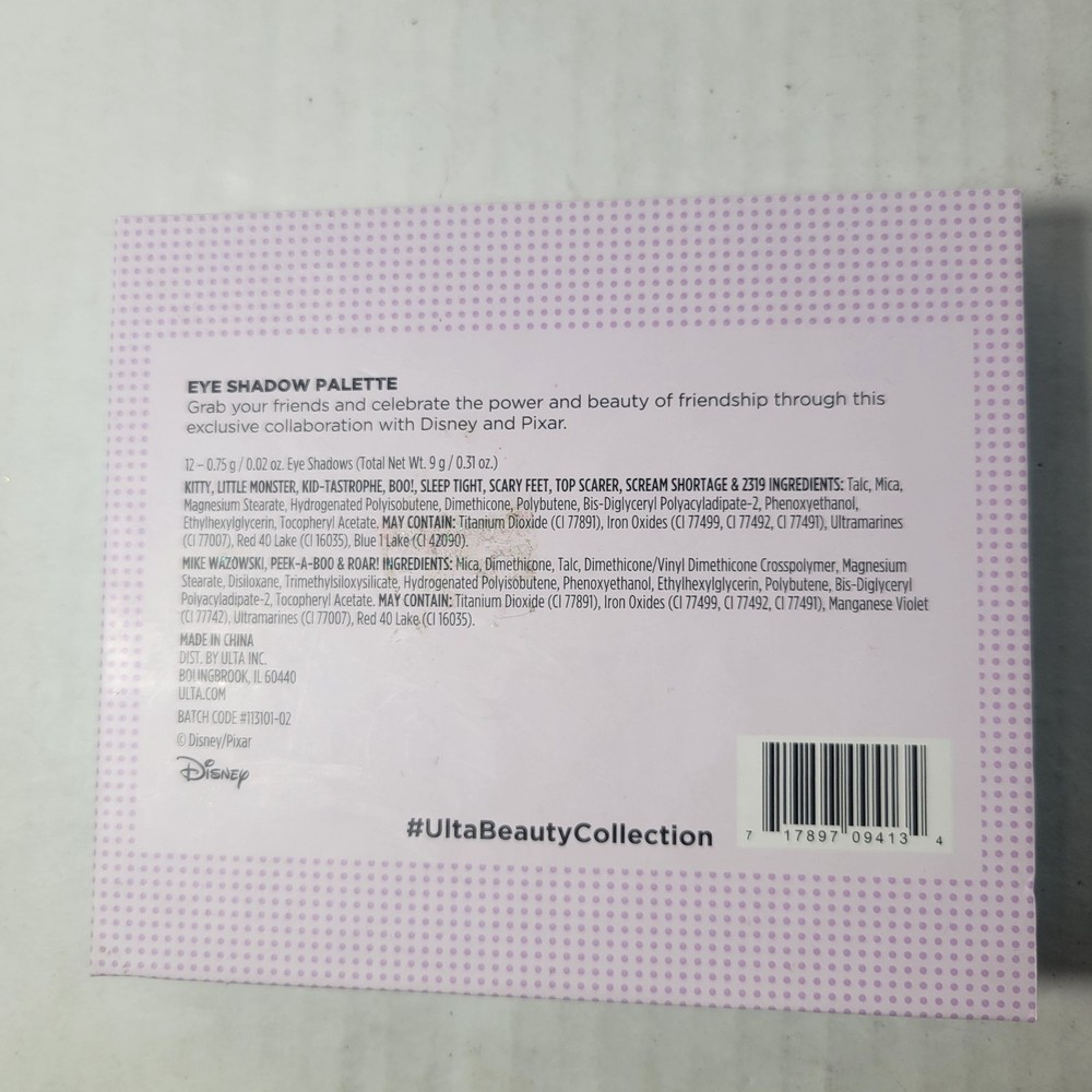 This eye shadow palette features 12 vibrant shades inspired by Disney Pixar's Monsters Inc., offering a versatile range for various makeup looks. • 12 Eye Shadow Shades • Collaboration With Disney Pixar • Includes Mirror • Mix Of Matte And Shimmer • Compact Design New without box Condition: New Without Box