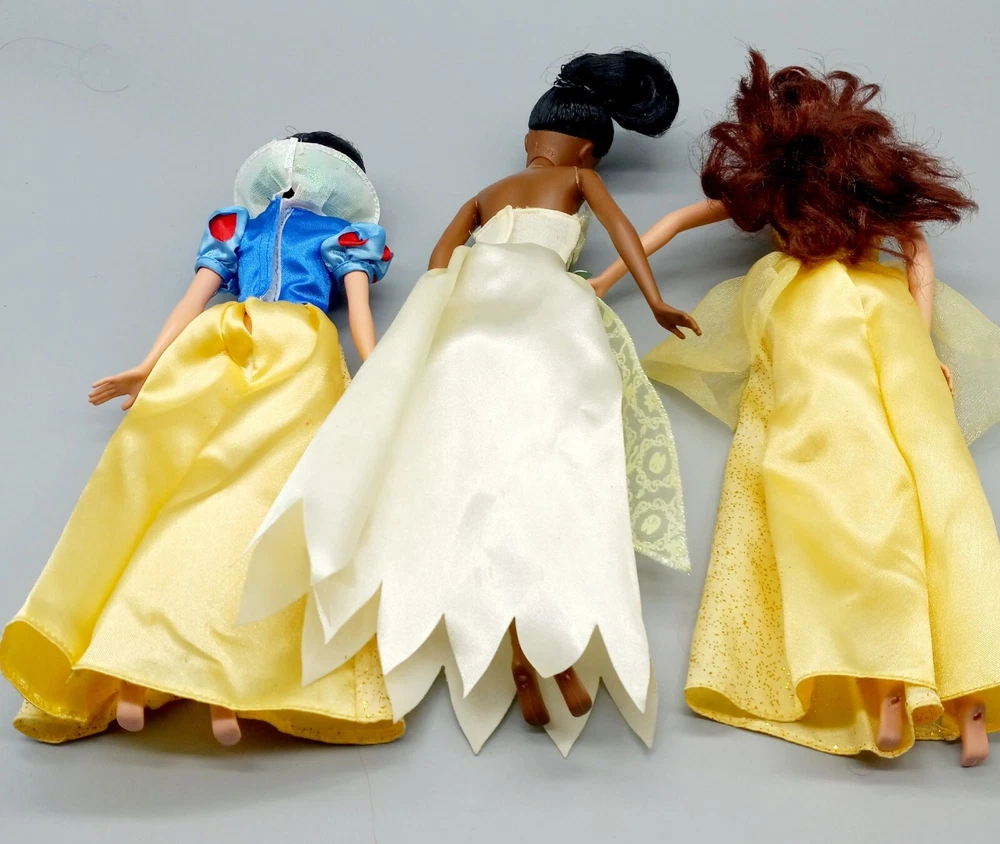 Embrace the magic of Disney with this charming lot of 3 Barbie Fashion Dolls, each standing at 10 1/2 & 11 inches tall. The collection features beloved characters Belle, Tiana, and Snow White.. Crafted from durable plastic with cloth elements, These fashion dolls, with their varied hair and eye colors, are perfect for collectors and young fans alike. The set comes with three dolls , allowing for varied display or imaginative play. Celebrate the fashion and beauty theme with these original licensed reproductions that capture the essence of the iconic characters and their enduring stories.
