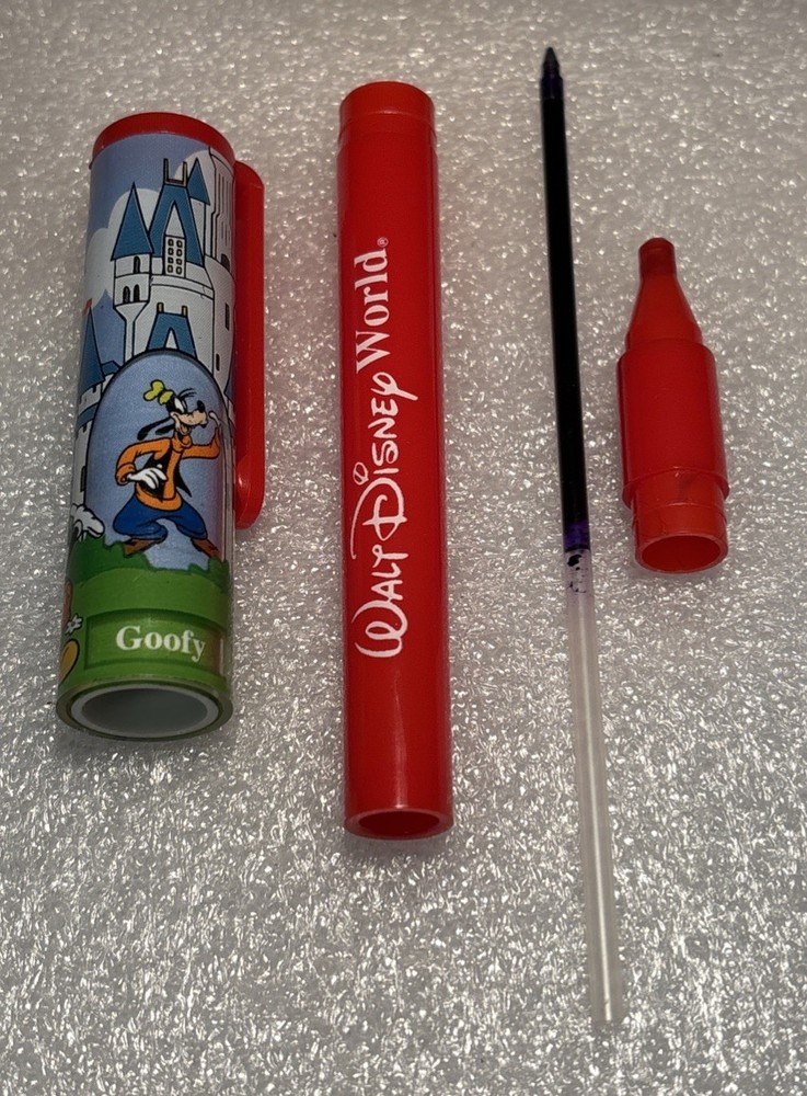 This is a pre owned ink pen with black ink. It manually spins to reveal selectable Disney Characters in a small window in the pen cap. It can be refilled with readily available ink from online retailers.