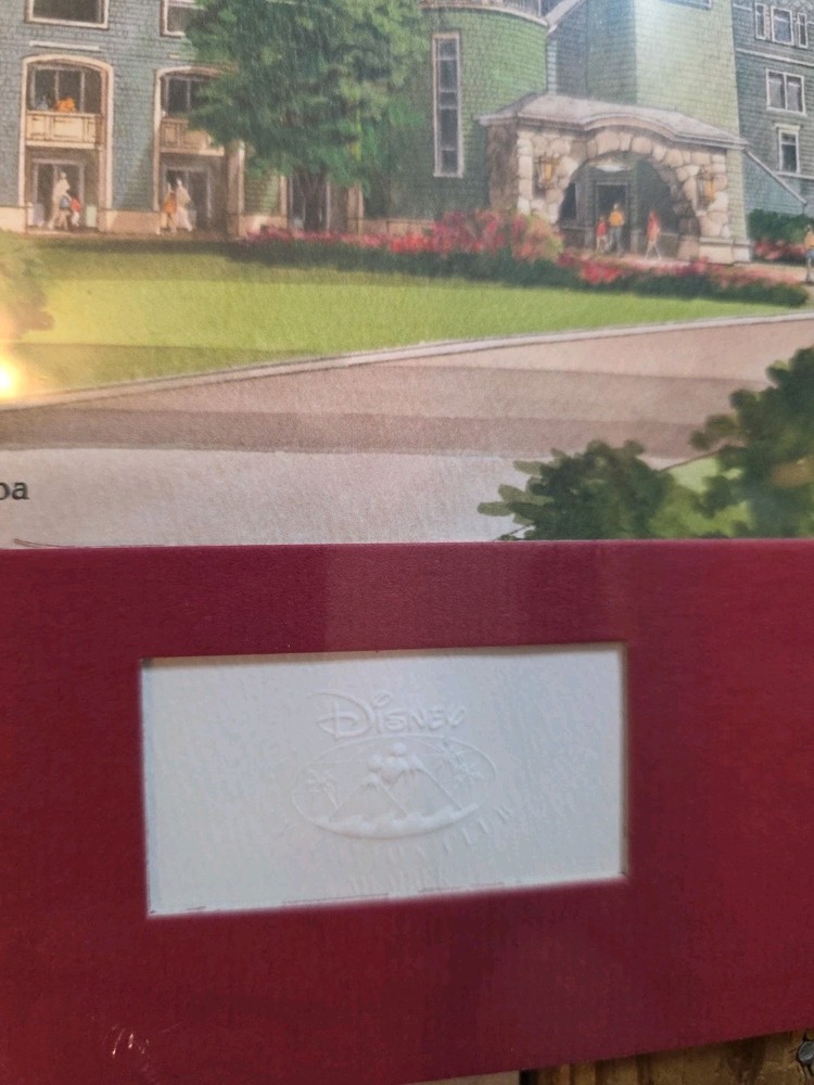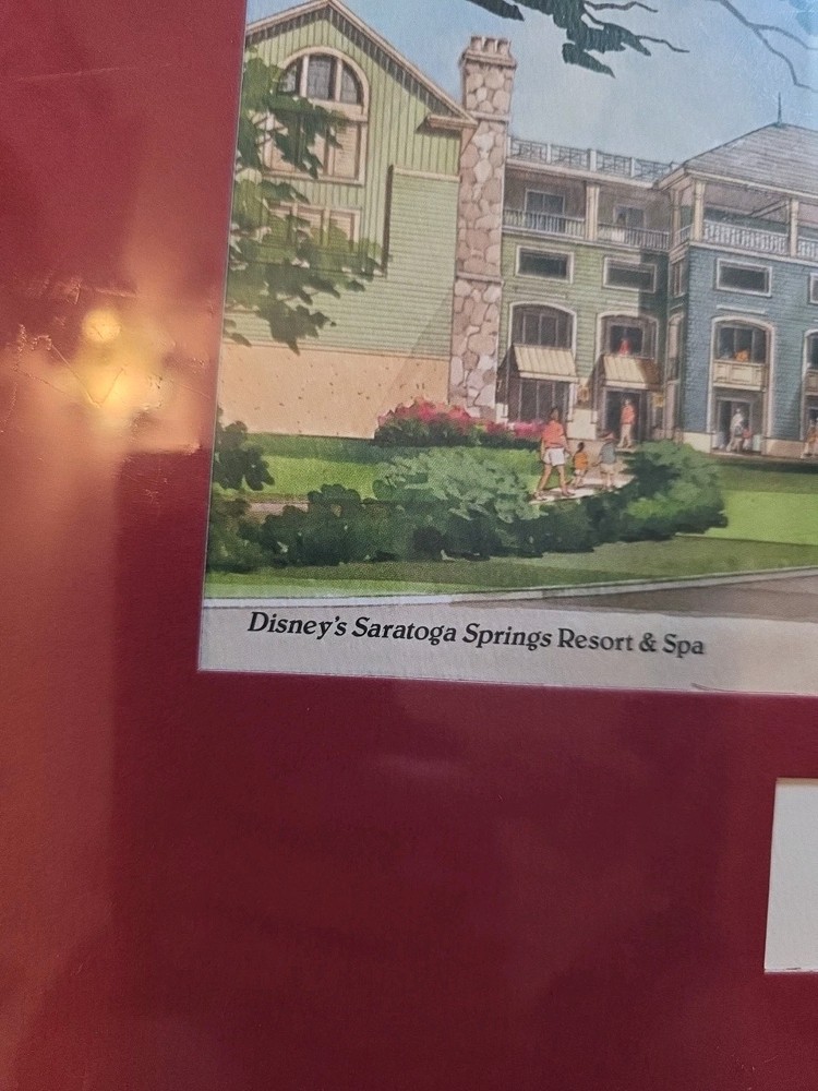 Disney’s Saratoga Springs Resort & Day Spa Club Members 11”x13” Matted Print NEW. Full color illustration of the Disney resort, embossed with Disney logo, matted in burgundy mat, sealed in plastic. Small tear in plastic on back as shown.