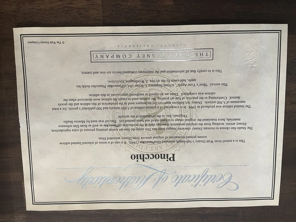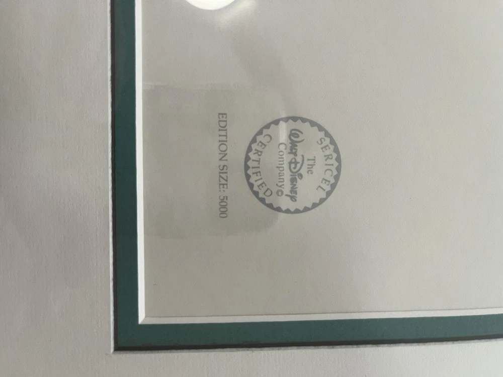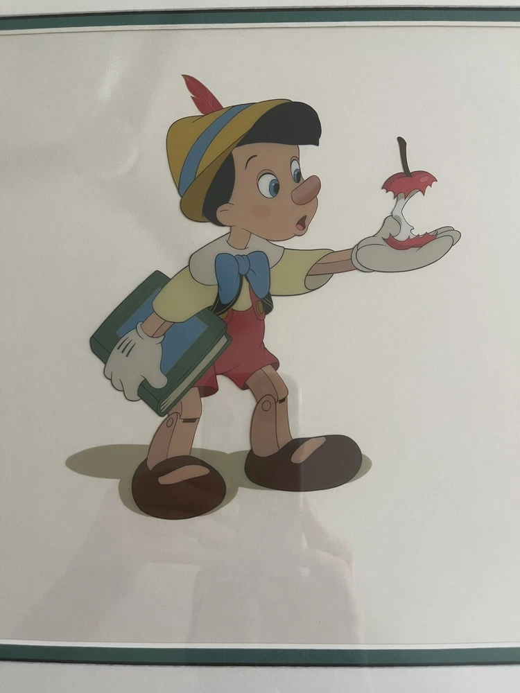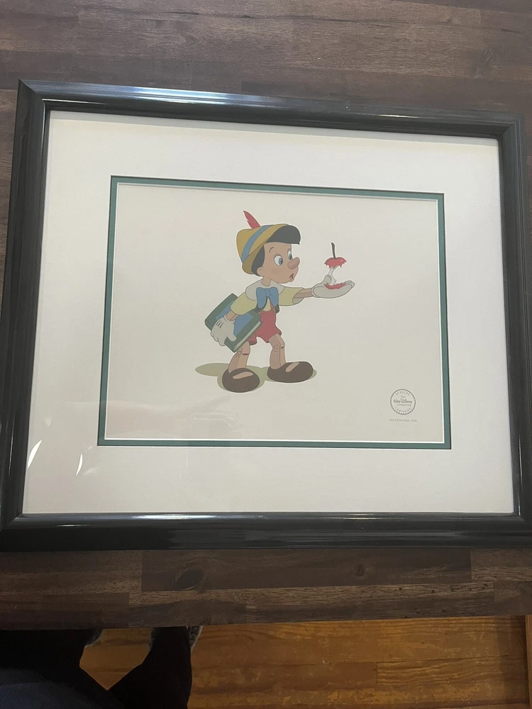 This Disney Sericel Pinocchio collectible is a must-have for any fan of Western Animation. The piece features a beautifully framed reproduction art of Pinocchio, a beloved character from the Disney franchise. The item was produced in 1994 and comes with a Certificate of Authenticity. The collectible is a Sericel, a type of animation art that is signed and comes framed. It features an image of Pinocchio with an apple design and is perfect for display in any animation-themed collection. This item is an original and licensed reproduction of the classic character and is a great addition to any collection.