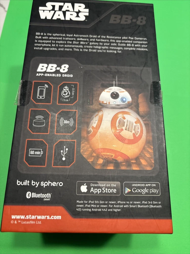 This Disney Sphero Star Wars BB-8 App Enabled Droid Model R001 Row is a must-have for any Star Wars fan. With its unique design and advanced features, this collectible is perfect for display or play. The device is inspired by the beloved character BB-8 from the seventh Star Wars movie, "The Force Awakens," and is sure to delight fans of the franchise. The Sphero BB-8 is a science fiction and horror collectible that is perfect for any Star Wars enthusiast. It comes in an open box and includes all the necessary parts. This app-enabled droid is perfect for convention/event or movie premieres, and its unique features make it a great addition to any Star Wars collection.