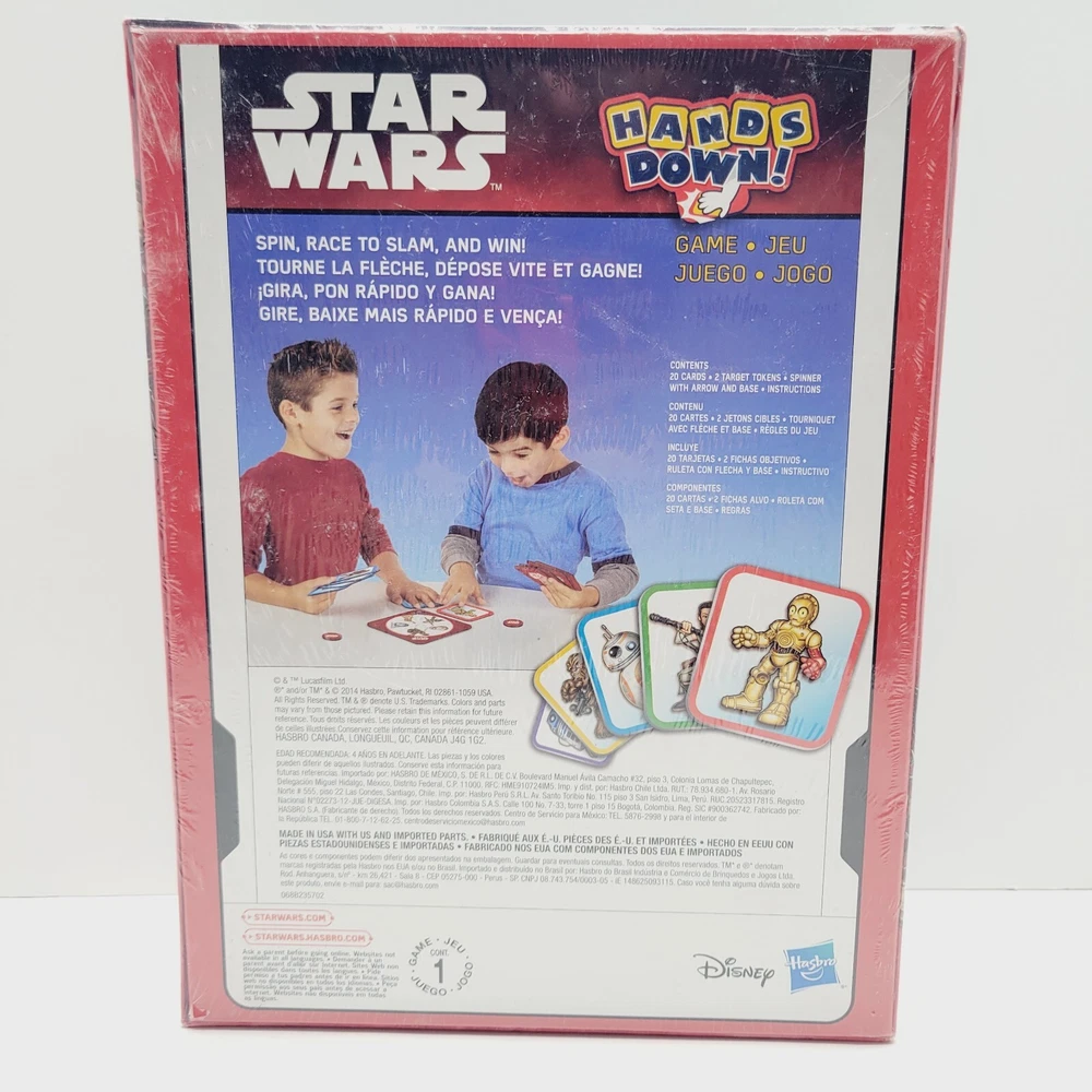 Gender:Boys & GirlsTheme:Star WarsGame Type:Children's GameType:CardsBrand:HasbroGame Title:Hands Down Star WarsYear:2014Age Level:4-7UPC:630509331925Recommended Age Range:4+Modified Item:NoMin. Number of Players:2 or moreCharacter Family:Star Warsgtin13:630509331925