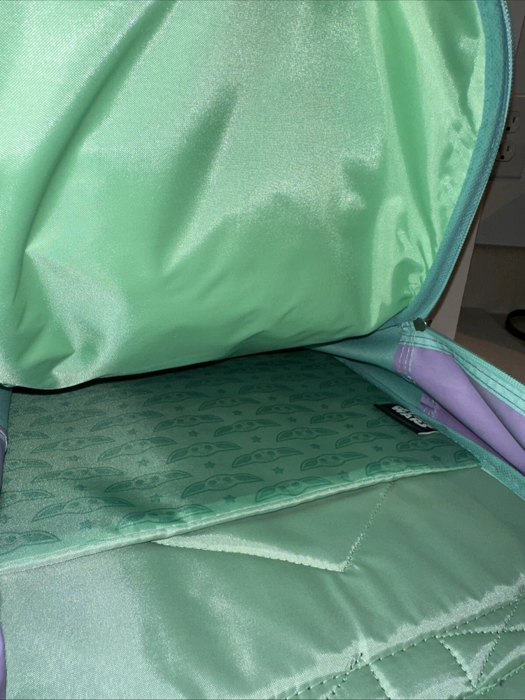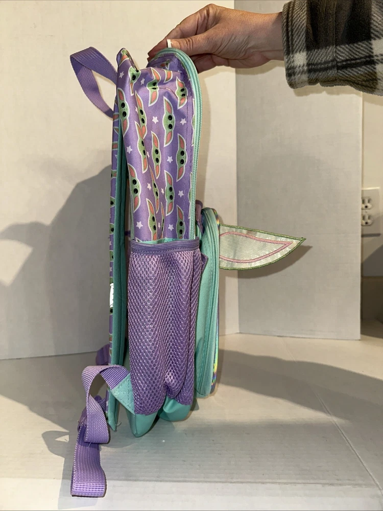 Get your hands on this amazing Disney Star Wars Mandalorian Baby Yoda Backpack With Lunch Bag in Green. The backpack is made of 100% polyester and features a zip closure. It is a large size, measuring 12 inches in width, 18 inches in height, and 4 inches in depth. The backpack is adorned with sequins and has a stars theme, making it perfect for any Star Wars fan. The unisex backpack is perfect for kids, and the backpack is brand new.