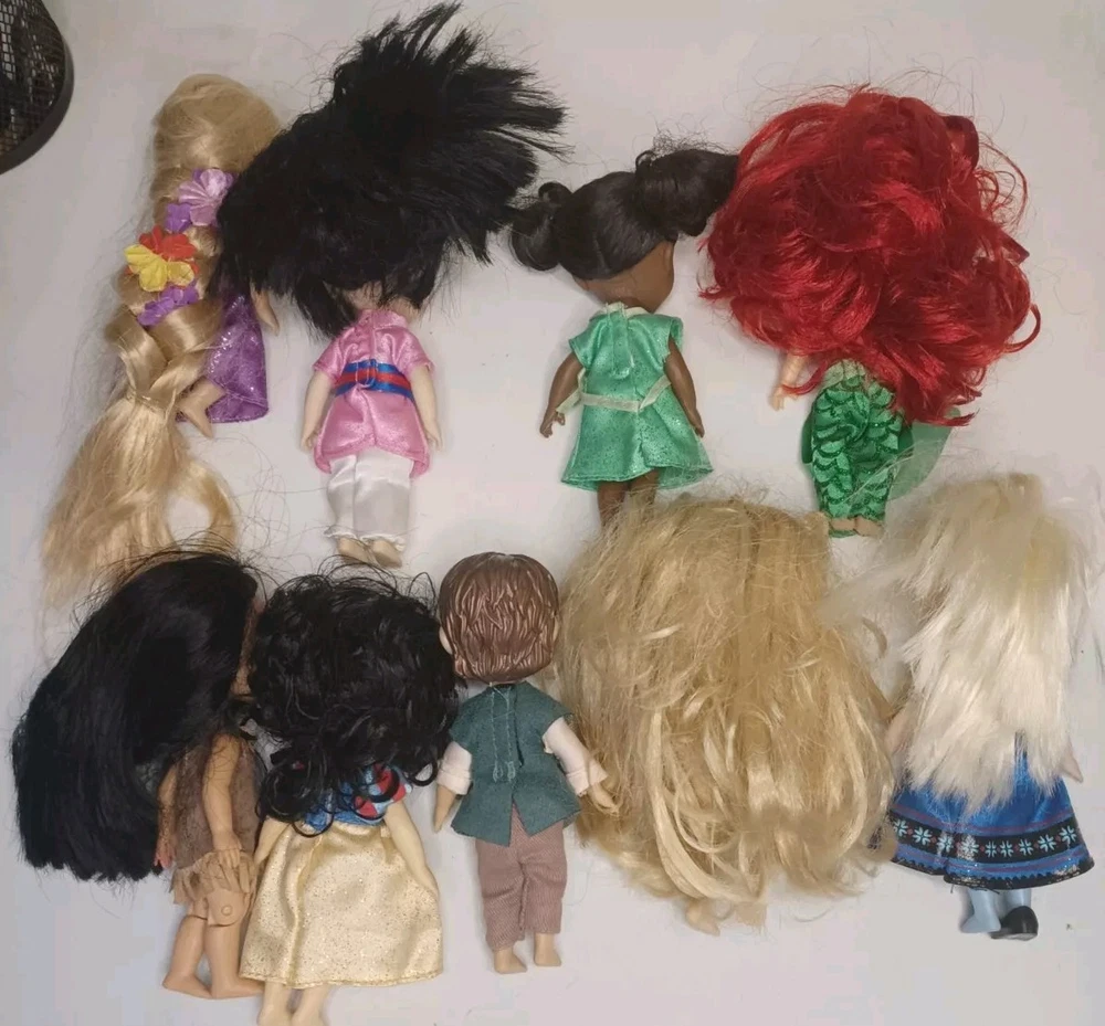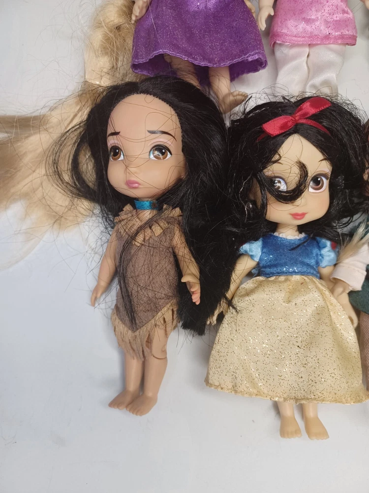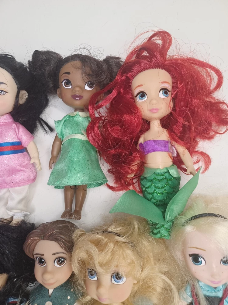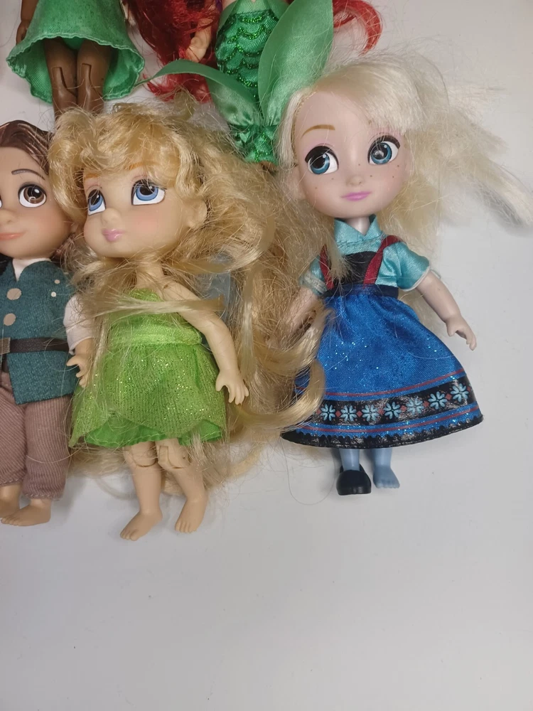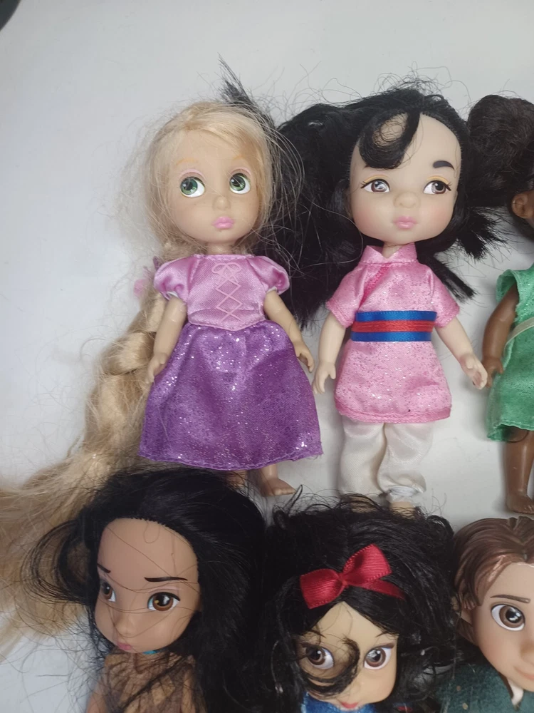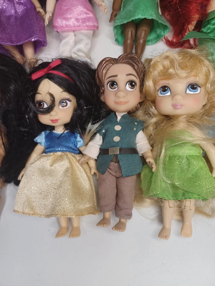 This lot of 9 Disney Store Animators 5" Collection Mini Dolls is perfect for any collector or fan of the beloved Disney Princesses. These dolls feature a variety of hair types, colors, and styles, including wavy, curly, straight, and multiracial. They come in their original packaging or without packaging, and are perfect for all occasions and age groups, from adults to children and teens.Hairs need grooming. The set includes popular characters like Mulan, Elsa, Pocahontas, Ariel, Rapunzel, Snow White, Flynn, Tiana, and Cinderella has Tinkerbell dress. These collector edition dolls are made of high-quality vinyl, hard plastic, and plastic materials, and are an original product line from Disney Animators. Don't miss out on the chance to add these beautiful dolls to your collection!