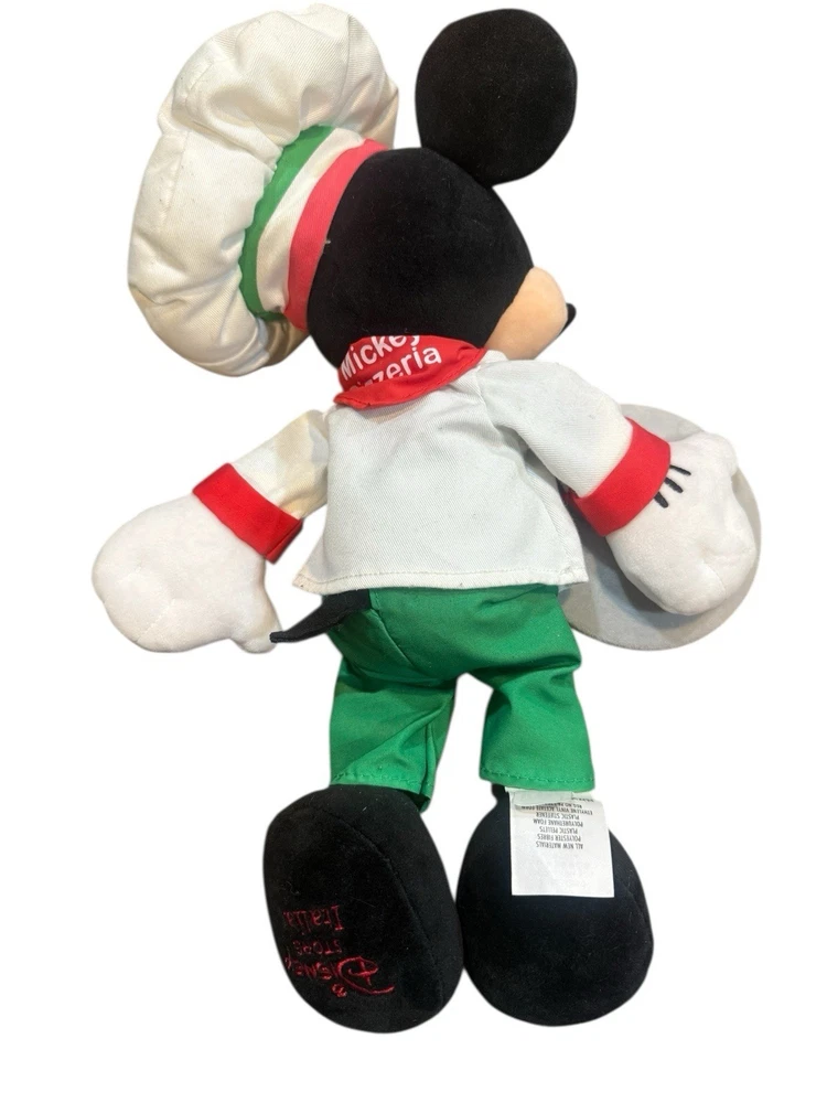 Bring the magic of Disney’s Epcot World Showcase home with this adorable Mickey Mouse Chef Plush from the Italy Pavilion! This limited-edition collectible, originally released in 2017 as a Disney Store Italia and Walt Disney World exclusive, features Mickey dressed as a charming Italian pizza chef. He’s ready to serve up some fun with his non-removable white chef’s jacket embroidered with “Chef Mickey” and an Italian flag, red and green accents, a “Mickey’s Pizzeria” neckerchief, and a tall chef’s hat. In his hand, he holds a soft plush pizza accessory complete with pepperoni toppings that hide a subtle Mickey shape. Key details: • Detachable magnetic mustache for customizable play. Still attached with plastic • Soft, huggable plush construction with bean-filled bottom for easy posing • Measures approximately 15 inches tall (including hat) – perfect for display or cuddling • Materials: Polyester, plastic pellets, polyurethane foam, plastic stiffener, and ethylene vinyl acetate foam • Embroidered “Disney Store Italia” on one foot, highlighting its exclusive origin • Tail and classic Mickey ears add to the authentic Disney charm This plush is in excellent pre-owned condition with no stains, rips, or odors – it looks just like new! It’s a great addition to any Disney collection, a fun gift for Mickey fans, or a nostalgic souvenir from Epcot’s cultural celebrations. Originally priced at $29.99, production was limited and it’s no longer available through official Disney channels, making this a rare find. Please review all photos for exact details, as they are part of the description. Smoke-free home. Ships carefully packaged to preserve its condition. Thanks for looking!