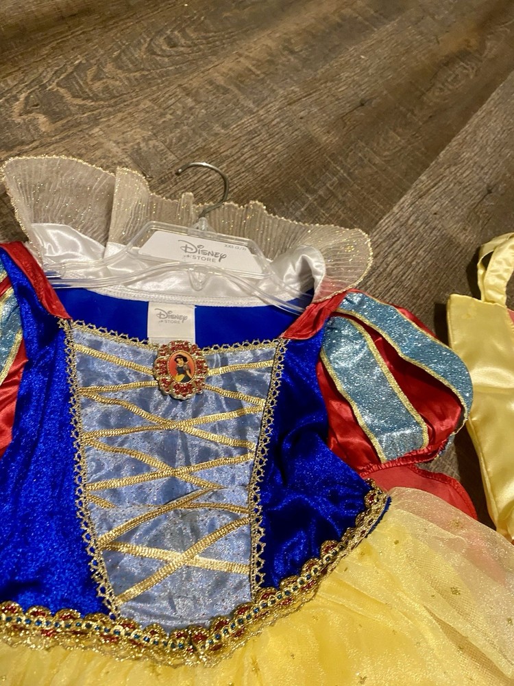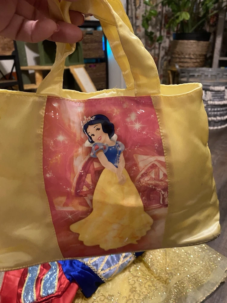 The Disney Store Snow White Princess Dress is a charming outfit for young children, featuring a multi-color design with styling elements inspired by the beloved Princess Snow White. Made of polyester material, the dress has a stretchy elastic quality for comfort and ease of movement. This Princess-themed set also includes a matching headband, shoes, and purse, adding a whimsical and complete touch to the overall ensemble. Made in China, this Disney-themed outfit is perfect for young fans looking to dress up like their favorite princess.