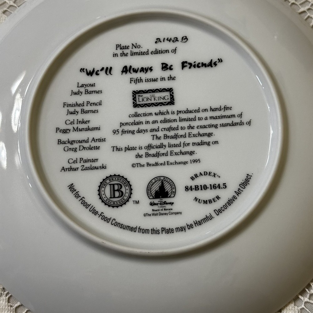 This vibrant art collector plate shows Mufasa and Simba playing in the grass under the beautiful stars! This art piece is from 1995 Bradford exchange and Walt Disney World. It’s in great and used condition. The only wear is on the gold rim of the plate as shown in the photos. Please review all pictures and ask any questions as this is sold as is. Thank you for your time! :)