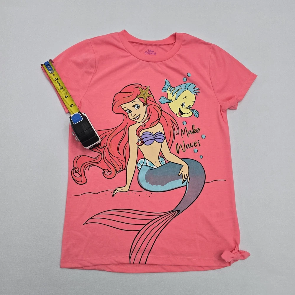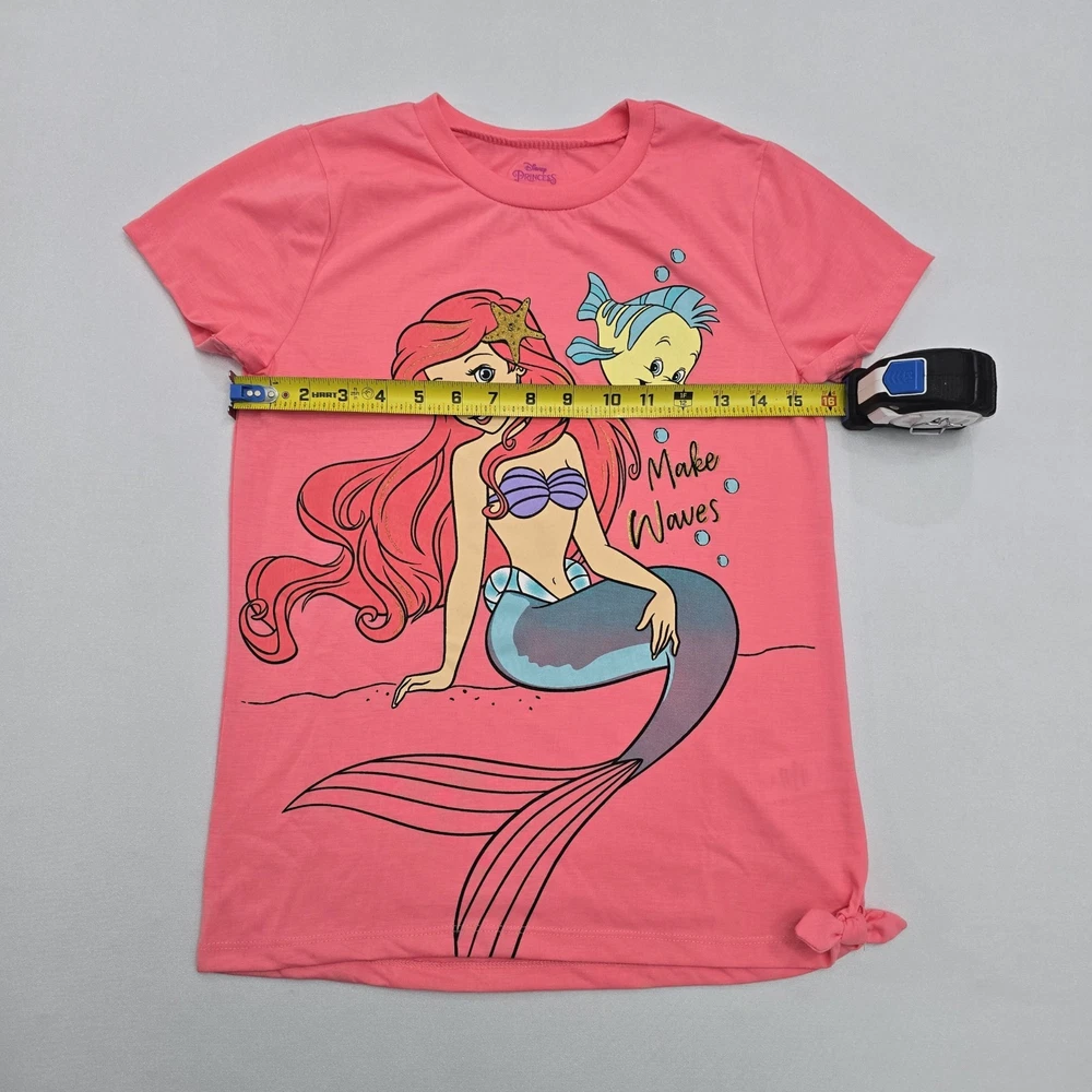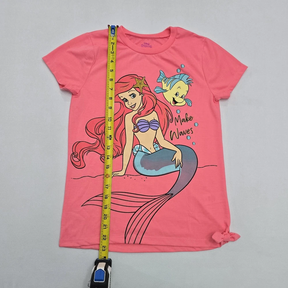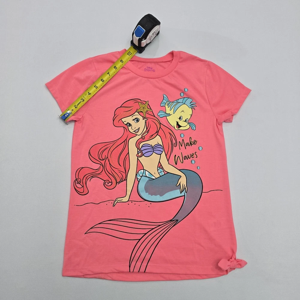 Material: 100% Polyester Fabric Type: Knit Fit: Regular Features: All Seasons, Easy Care, Lightweight Department: Girls Style: Basic Occasion: Casual, Travel, Party Sleeve Length: Short Sleeve Pattern: Graphic Print Character: Ariel, Flounder, Mermaid Vintage: No Type: T-Shirt Garment Care: Machine Washable Closure: Pullover Handmade: No Performance/Activity: School, Walking Country of Origin: Egypt Brand: Disney Size: 10-12 Color: Pink Personalize: No Accents: Bow Season: Fall, Spring, Summer, Winter Neckline: Crew Neck Character Family: Disney Theme: Mermaid, Princess, Cartoon, TV & Movie Characters