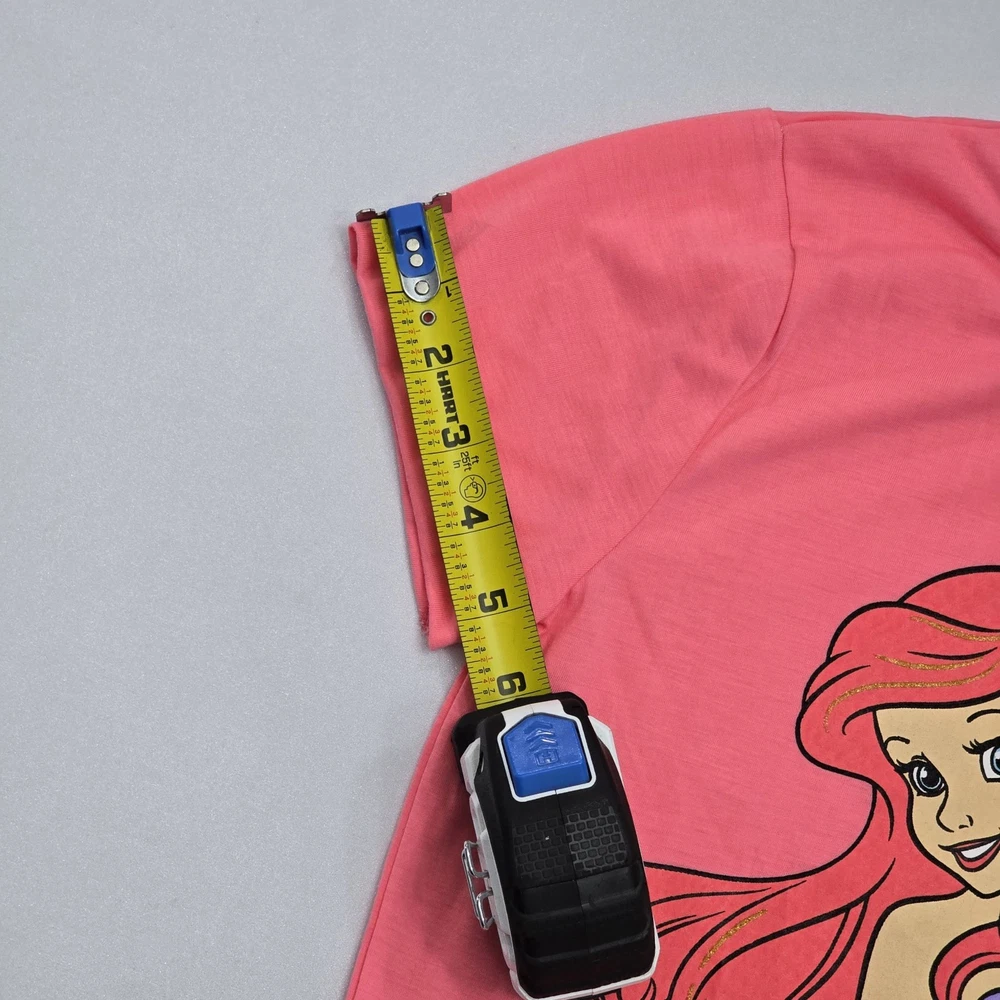 The product is a Disney The Little Mermaid Ariel and Flounder Graphic T-shirt for girls in size 10-12. The shirt features short sleeves and showcases the beloved characters from the Disney movie. Perfect for young fans of The Little Mermaid, this graphic t-shirt is a fun and stylish addition to any little girl's wardrobe. See Photos For EXACT Measurements