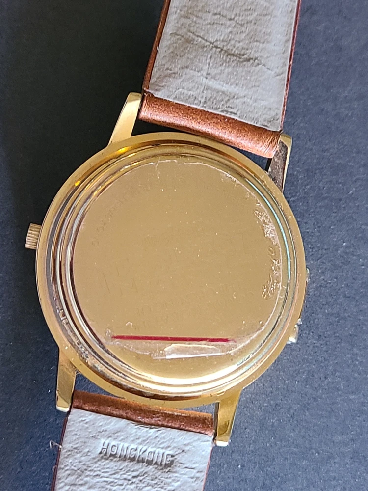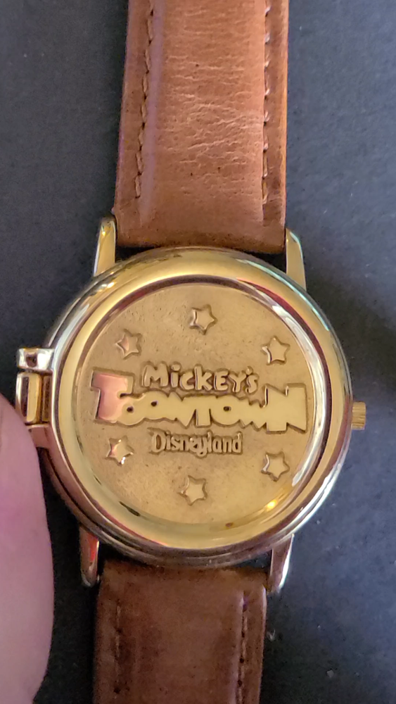 This listing features one of Disneyana watch collectors’ most coveted items ~ a rare Fantasma Disney Toontown Opening Day from 1993. These models are VERY hard to find, especially in this fabulous condition. Stainless steel caseback reads “Commemorating the Opening of Mickey's Toontown, Disneyland.” The watch is in beautiful condition, never worn. On the back of the watch, the plastic protective covering is starting to become undone. The gold-toned metal cover has "Mickey's Toontown Disneyland" with six gold stars. Press the button on the side and the cover swings open and the watch element springs out! The colorful dial featuring Mickey, Minnie, Goofy, and Donald Duck. Red circles on the underside of the crystal mark the hours. This whimsical beauty sports the original brown leather band. A new battery placed and the watch is running strong. It ships without box or papers. Protect yourself and your money! You work hard for your dollars, don't give them away to just anybody. We have been trusted eBay sellers for almost 25 YEARS and our feedback reflects the high level of customer satisfaction you can expect from us! Read your auctions carefully before bidding. We NEVER ship out watches that aren't running or need batteries (unless stated otherwise in ad, such as with a vintage watch or one sealed in original packaging). And all of our items are official merchandise from the licensed manufacturer, not cheap knock-offs. Please note that all pictures and ad content are COPYRIGHT and may not be used without permission. We have a generous return policy! When you buy from someone listing a watch that "just needs a battery" or sold "as is", check their return policy! If you receive an item that is not working you will be stuck with a non-working watch. Our watches have a new battery professionally placed before shipping, unless the item is still in original packaging and needs a battery. SMOKE-FREE ENVIRONMENT 9