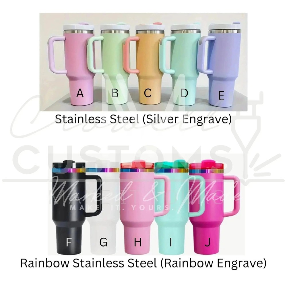 Calling all Disney Toy Storyfans! Show off your Buzz Lighteay and Woody pride with our custom engraved Quencher Tumbler Available in 30 oz Stanley Dupe, 40 oz Stanley Dupe, and Genuine Stanley Branded variations featuring a Toy Story theme. Unlike decals, our designs are laser etched onto the stainless steel and will last for the lifetime of the cup. Add a stainless steel or rainbow metal straw to your order for a complete set. Our tumbler features a design with the iconic Movie Characters. Want to personalize it with your name or add a quote, character, or something else? Let us know in the personalization field. Made with high-quality, stainless steel and double insulated, our tumblers are built to last. Some colors are coated to add a unique engraving effect. These fit all Stanley accessories, including lids, toppers, sleeves, and more. They are full dupes of the Stanley Quencher H2.0 Tumbler, down to the matching lids, handles, and color inlays on the tops and handles as well. No sweating, keep your drinks cold for hours. If your desired color is not pictured, check out our other listings or our TikTok for videos of all available colors and design ideas. Upgrade your tumbler game and join the macical world of Disney with our high-quality, custom engraved Quencher Tumbler Available in 30 oz Stanley Dupe, 40 oz Stanley Dupe, and Genuine Stanley Branded variations . Order yours today and get ready to impress! Looking for a custom Stanley Tumbler? Select it in the dropdown! Looking for smaller 30oz options? Select it in the dropdown! We also take custom design requests, perfect for business logos, promotional items, gifts, and more. Some Product Photos may show varying tumbler styles (30 oz, dupe, 40 oz dupe, and Stanley-branded variations). Please select the tumbler type from the drop-down menu that you wish to purchase! We offer non-branded and genuine Stanley-branded options. The cup you will receive will be the color you select in the drop-down menu, with the design pictured in the listing. The design may be modified using the personalization field, and it may also be modified to accommodate the size of your cup. Colors vary by monitor, we try to make sure our colors are as close as possible to real life, but slight differences in display color vs actual color may occur.