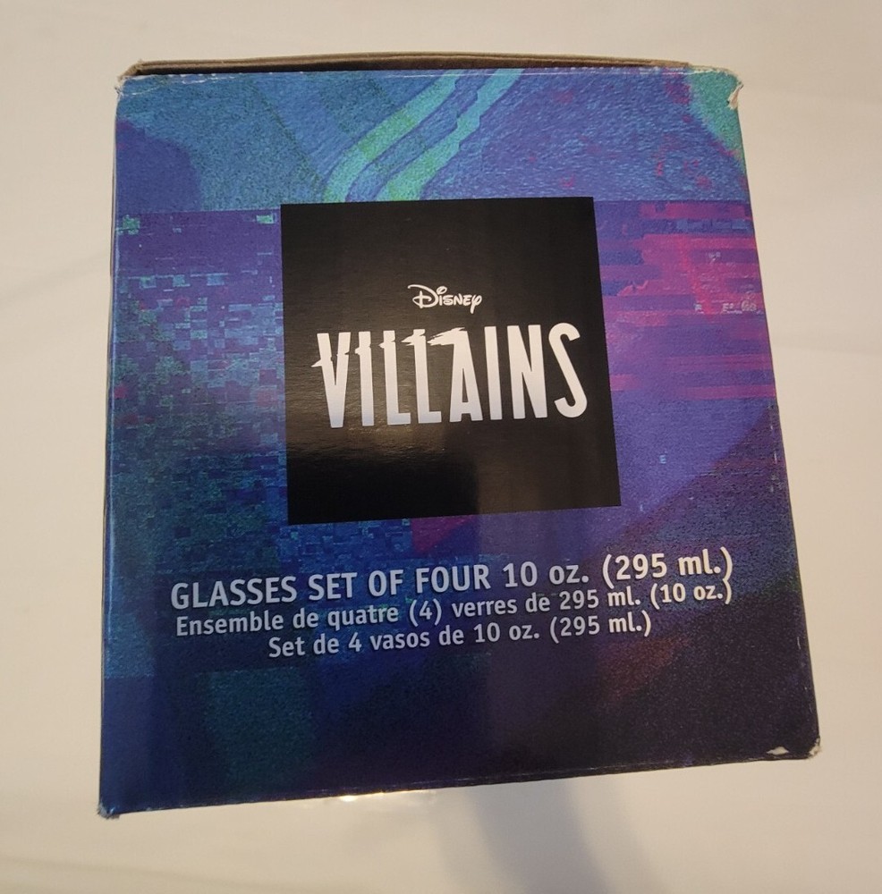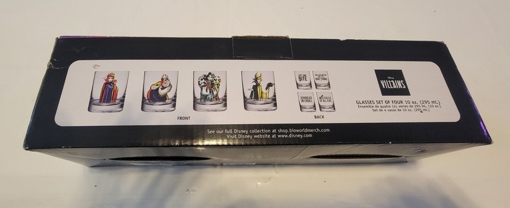Create a magical drinking experience with this Disney Villains set of four 10oz glasses. Featuring iconic characters Ursula, Maleficent, Cruella, and The Evil Queen, each glass is made of high-quality glass and designed to elevate your drinking experience. Hand wash only, these glasses are perfect for all occasions and make a great addition to any Disney lover's collection.