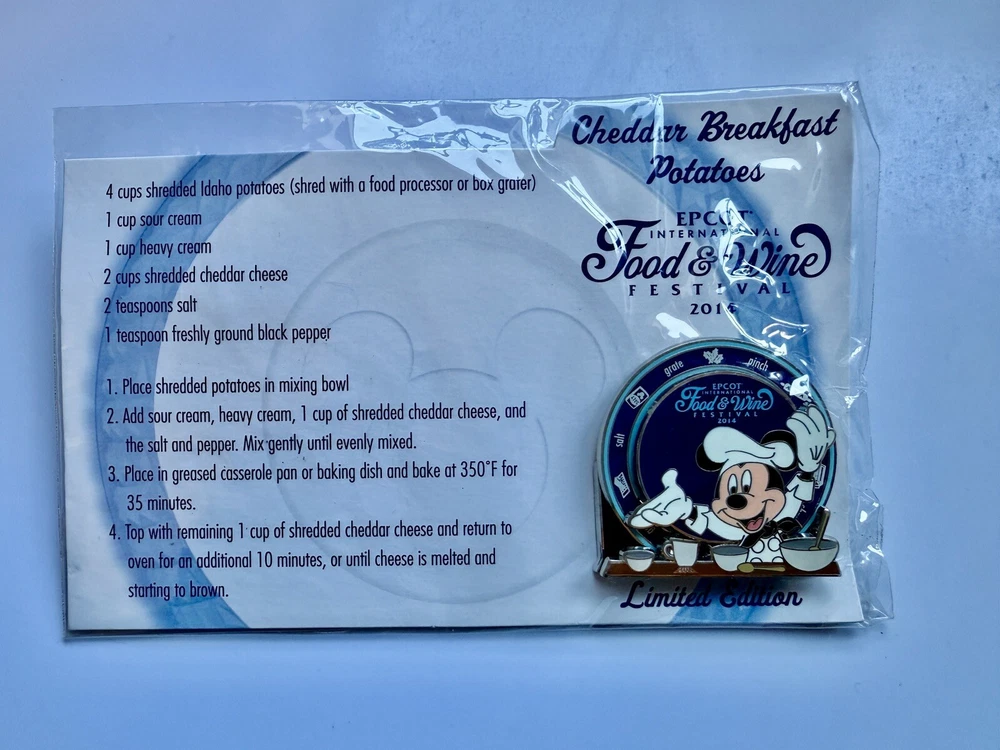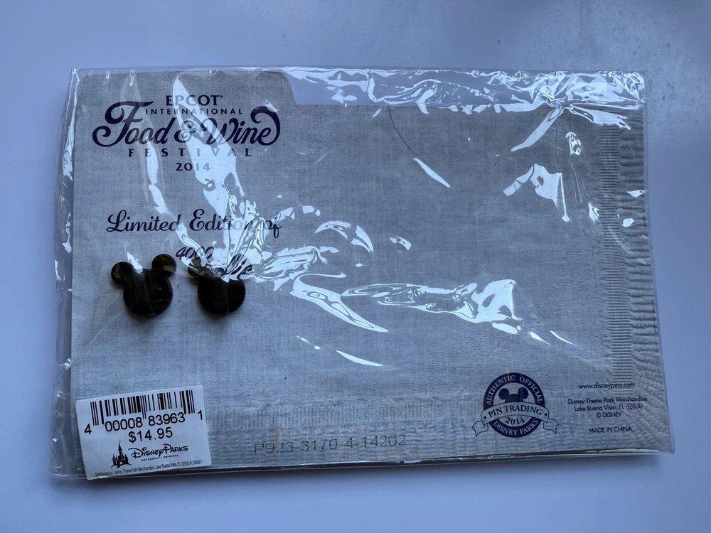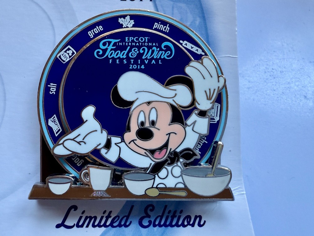 This Disney pin featuring Mickey Mouse was released in 2014 for the Epcot Food & Wine Festival. It is a limited edition item, with only 4000 made and is part of the Disney franchise. The pin comes on a card and is a collectable piece of Disneyana.