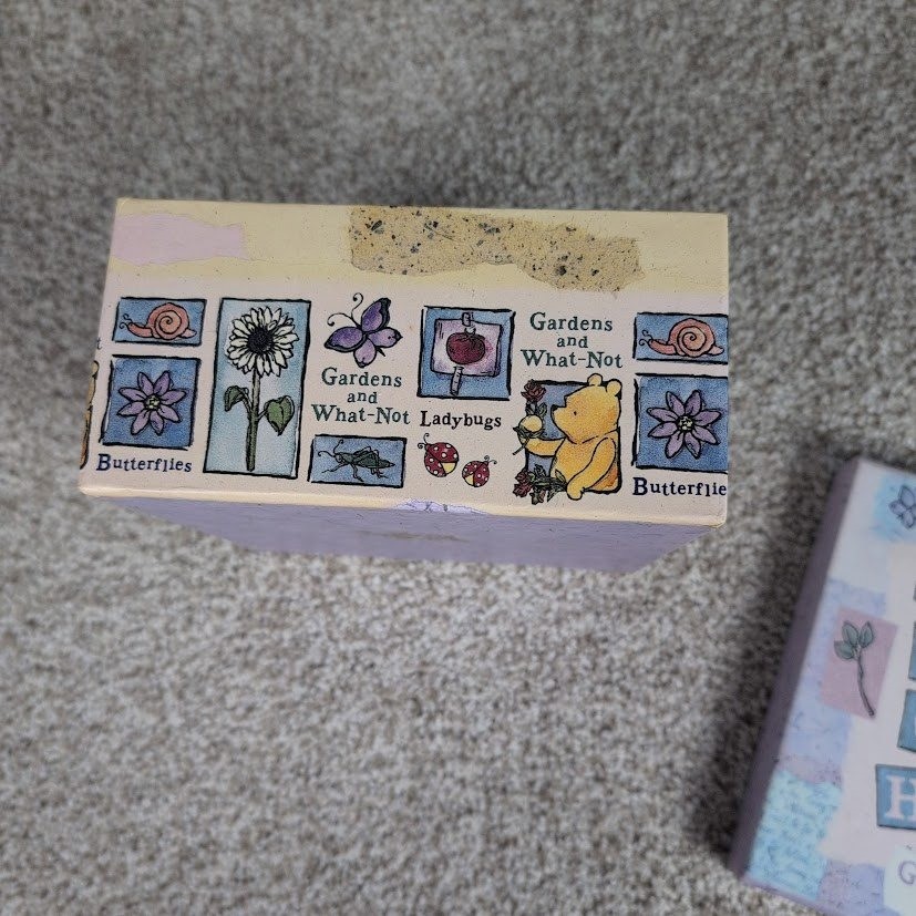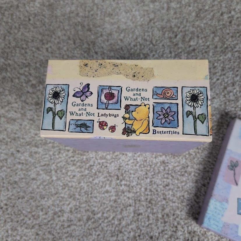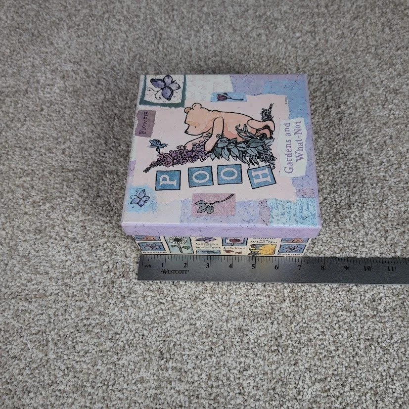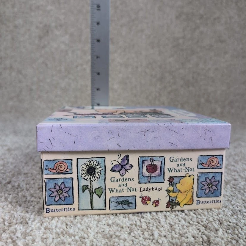 Vintage Winnie the Pooh Gardens and What-Not memories box See Pictures for measurements Perfect decor for a nursery or kids room Some wear and tear on the bottom From Smoke Free/Cat Friendly Home Keywords: Winnie the Pooh, Disney, Box, Gardens and What-Not, Flowers, Butterflies, Collectible, Decorative Box, Pooh Bear, Storage Box, Disneyana, Vintage Disney