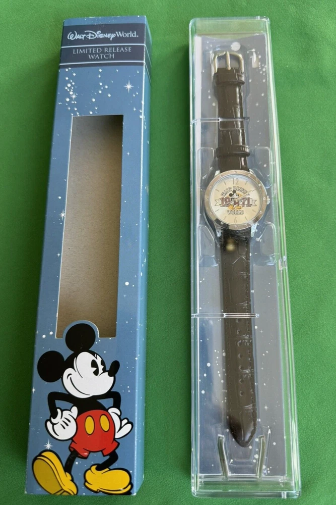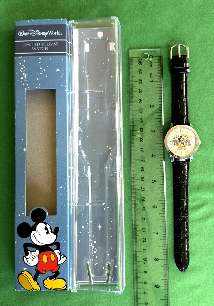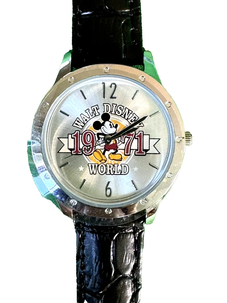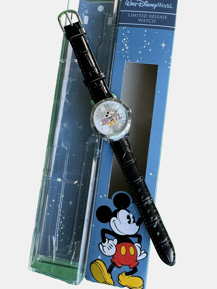 This Walt Disney World Limited Time Release Silver Tone Watch Mickey Mouse 1971 is in New Condition! Old Stock! The Watch Comes with Original Ban and Case . Great for Mickey Mouse Fan or Collector! Tested and Keeps Time. Ready to Collect, Gift or Wear. Recommend Replacing Band to Save the Original if You Want to Wear it Every Day. Measurements: Dial is 1" Wide, Watch Case is 1,25" Wide, Length of Band is 7.5". Adult Size. For Men and Women's Wrist. Please See Pictures Before Purchase. If Any Questions, Feel Free to Contact Us. Thank You.