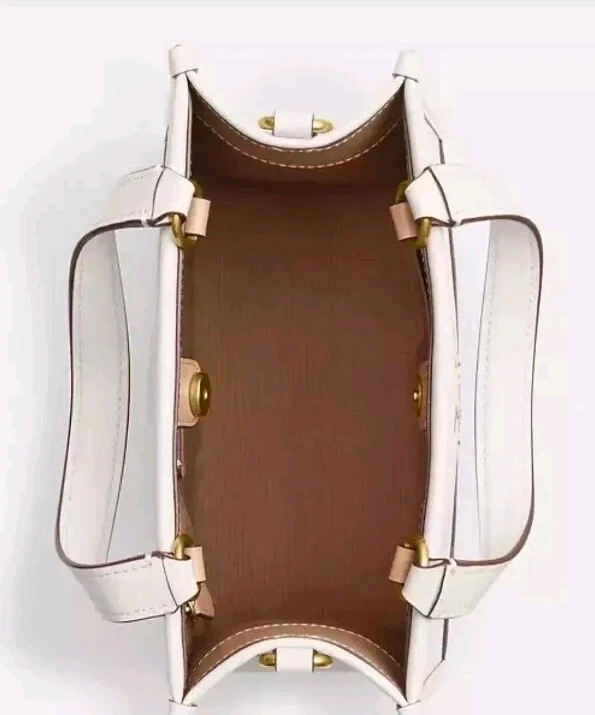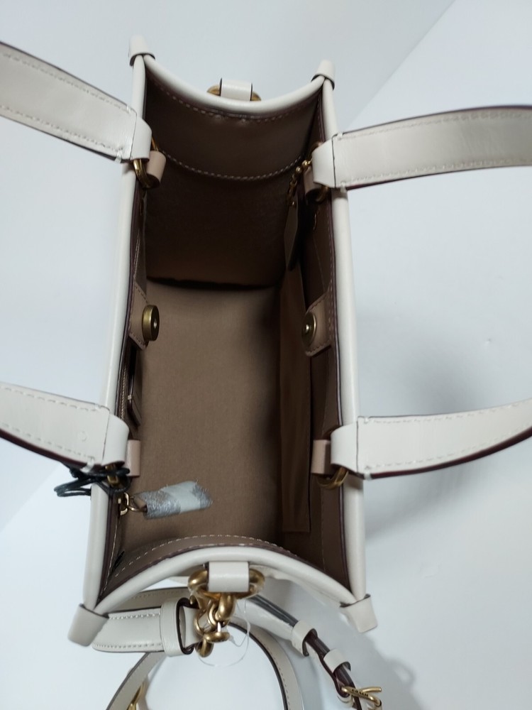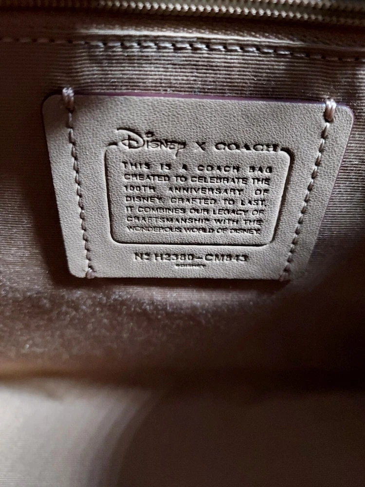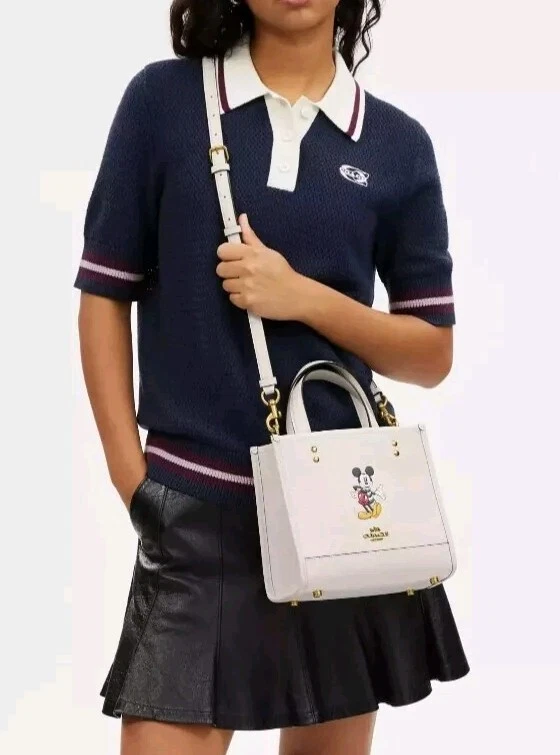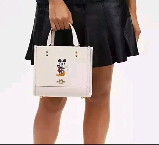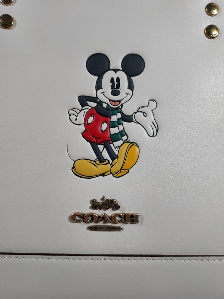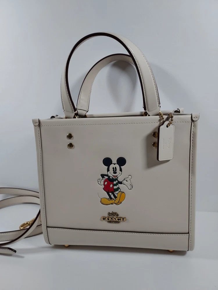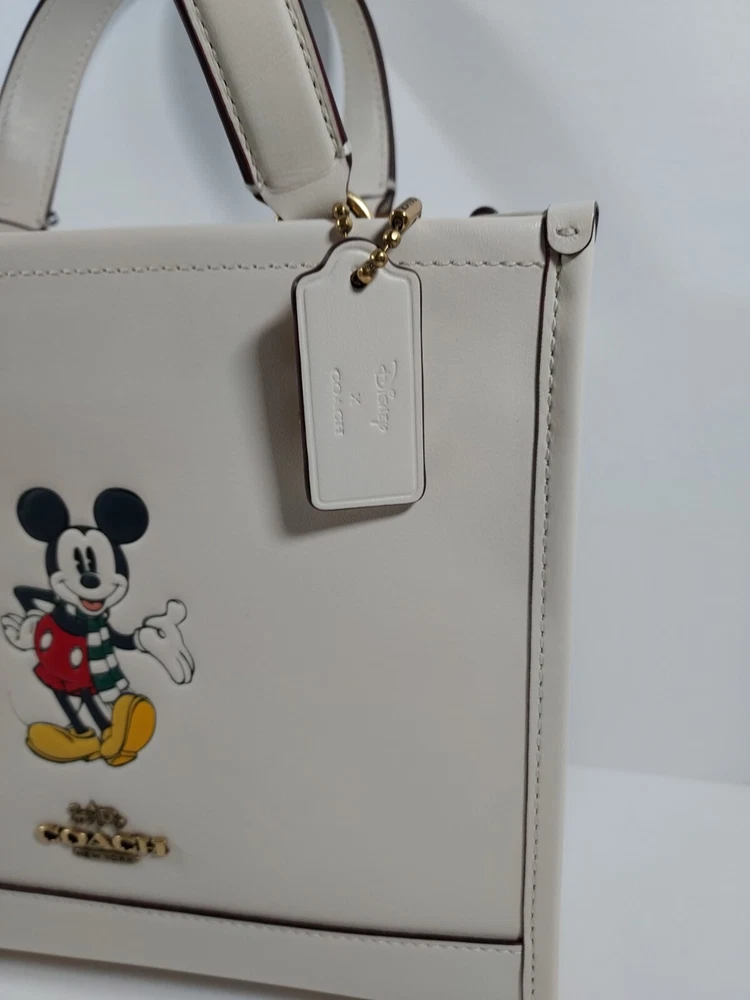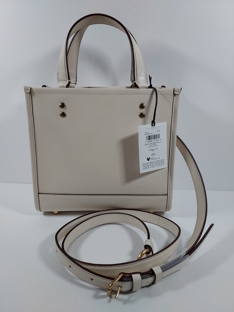100% authentic Coach Chalk Multi Leather Disney X Coach Dempsey Tote 22 With Mickey Mouse NEW WITH TAGS Chalk Multi/Gold Hardware Refined calf leather Inside zip and multifunction pockets Snap closure, fabric lining Handles with 4 1/4" drop Detachable strap with 22 1/2" drop for shoulder or crossbody wear Four protective feet at base 8 3/4" (L) x 7 3/4" (H) x 4 1/4" (W) Disney x Coach