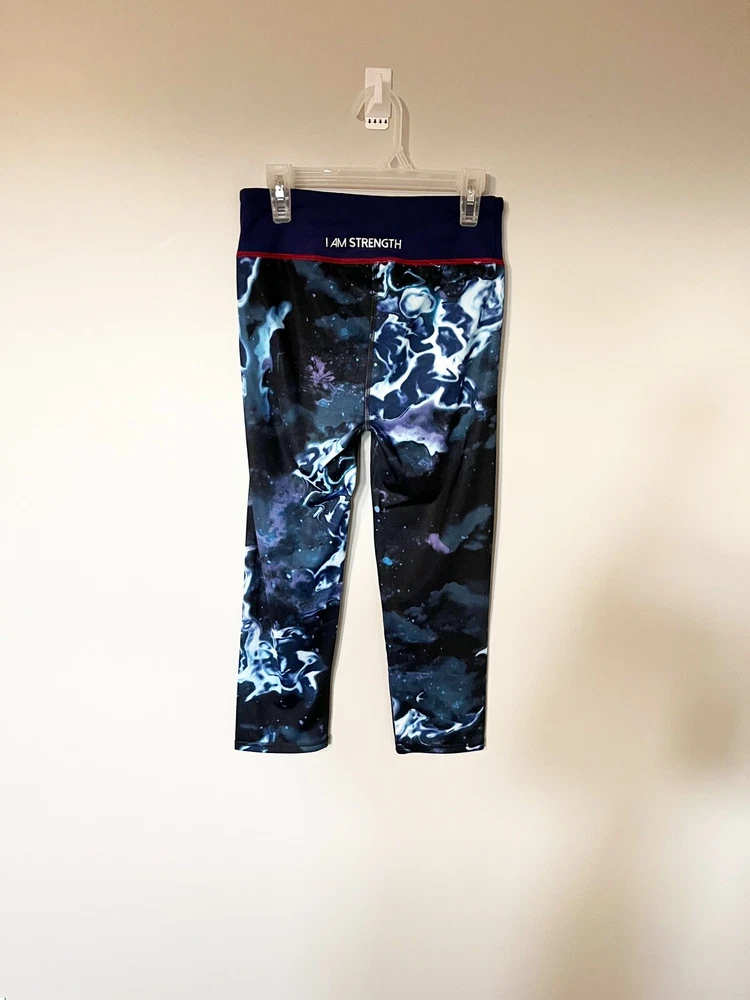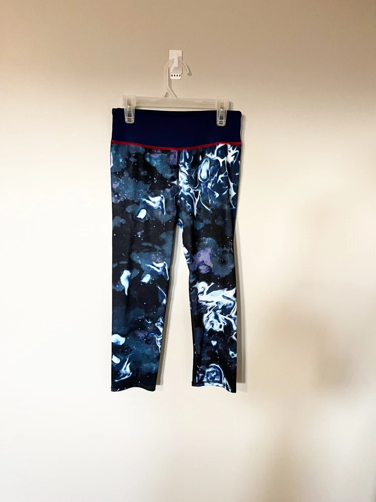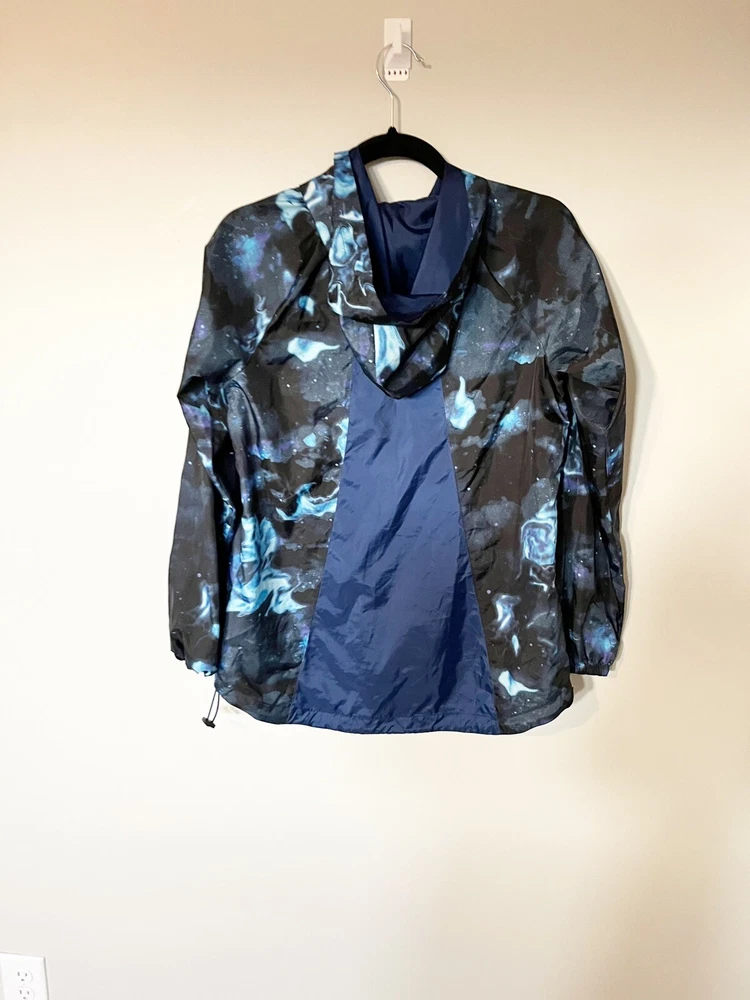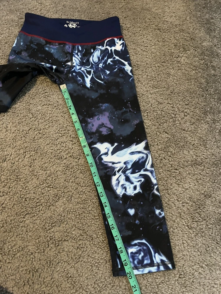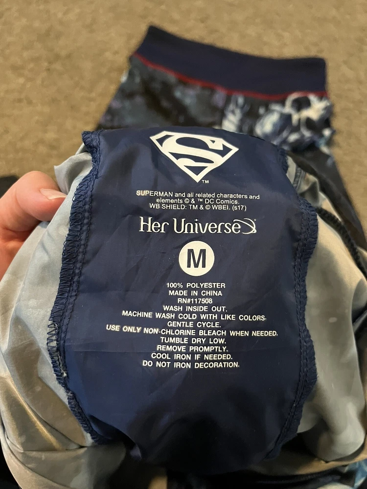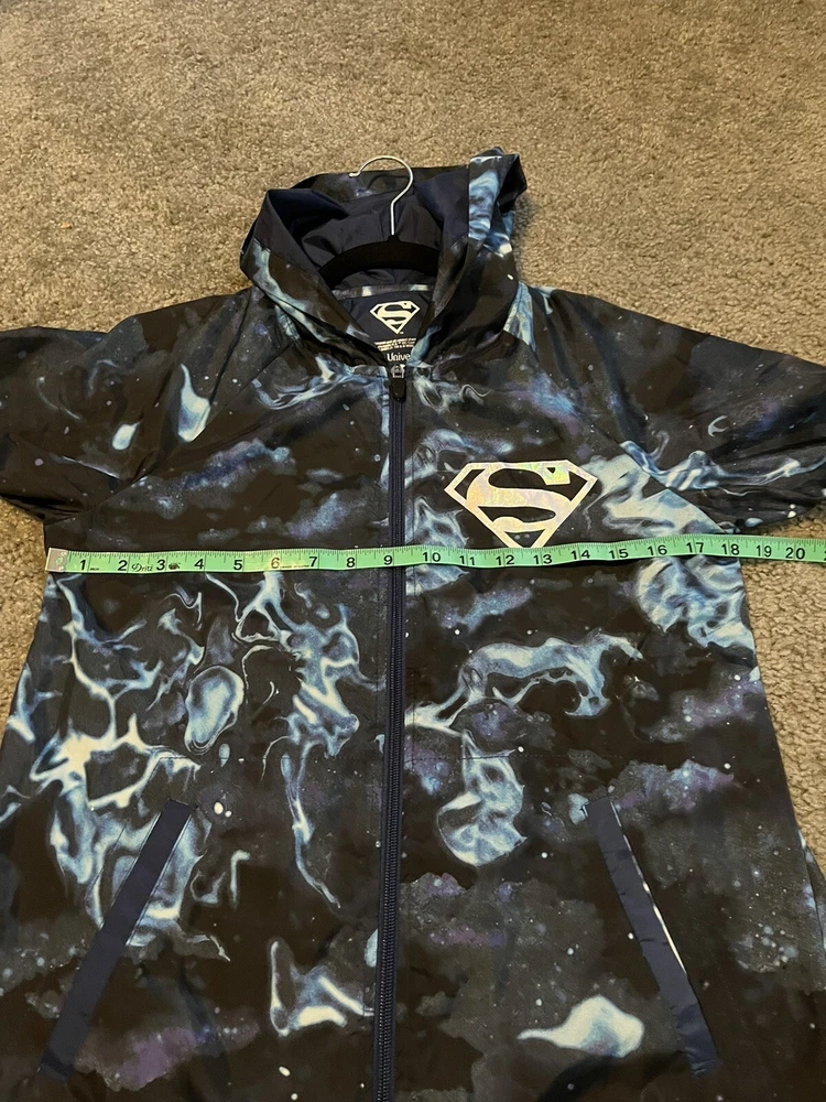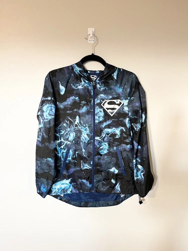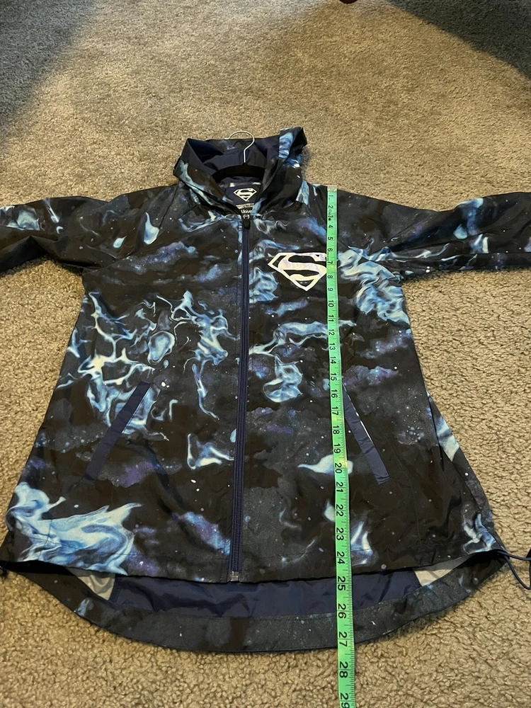 Her universe Size medium, see size chart included in pictures Galaxy print Lightweight windbreaker and cropped leggings Superman theme DC comics Excellent condition, zipper is a little stiff on jacket but not a flaw. Is the way it is made.