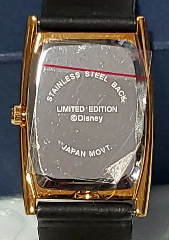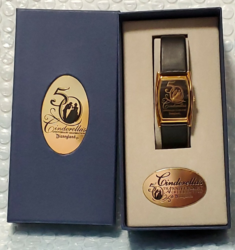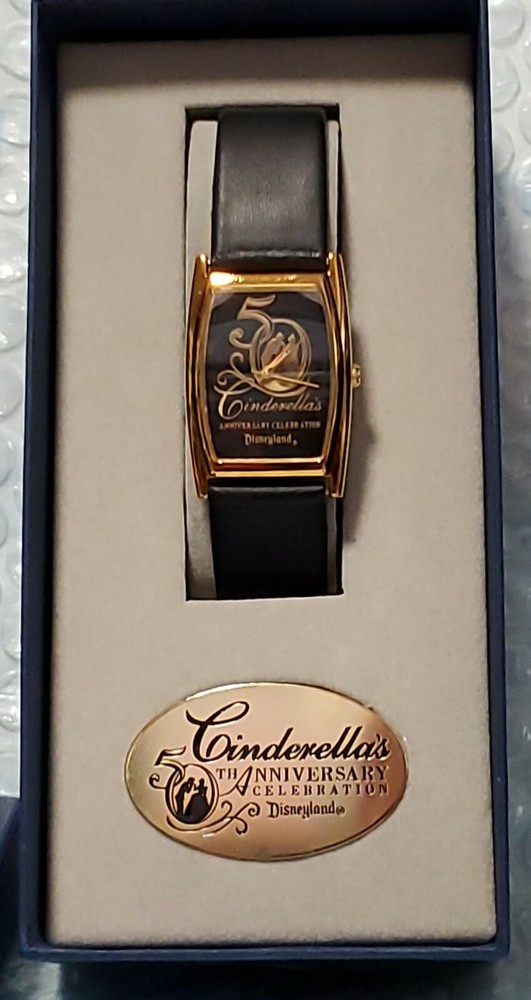 This limited edition watch was sold at Disneyland as part of the Cinderella's 50th Anniversary Celebration. The face of the watch features Cinderella and Prince Charming inside the 0 of 50. Below them is the text Cinderella Anniversary Celebration Disneyland. All in gold against a black background. Gold casing with leather band. Produced by Becora. Sold in the park for $85. Mint in original box, never been worn. Being as old as it is, it does need a new battery. Buyer pays for shipping within the US. I can combine shipping for multiple items. If you purchase multiple items, let me know when you are done. I will send you an invoice with the corrected shipping charge. See seller's other auctions for additional Disney collectibles.
