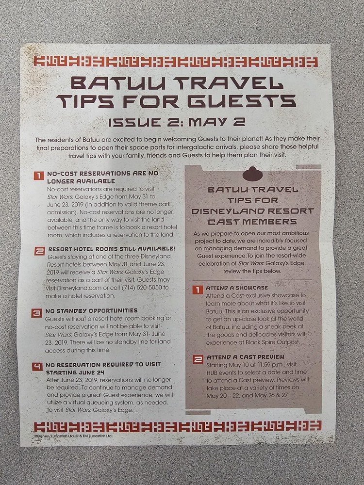 you are buying lot of two items - Disneyland Star Wars Galaxy's Edge Opening Day Park Glossy Map - mint condition - Disneyland Cast member's exclusive pre-opening Batuu travel tips - like new creased in the middle Please see photos for details