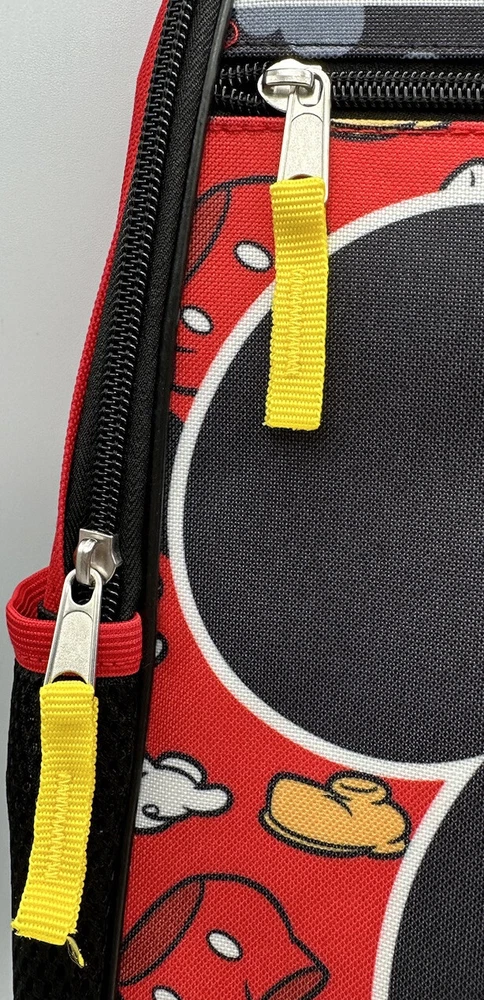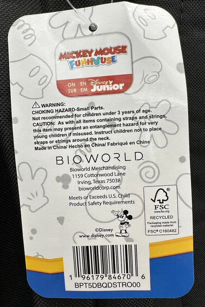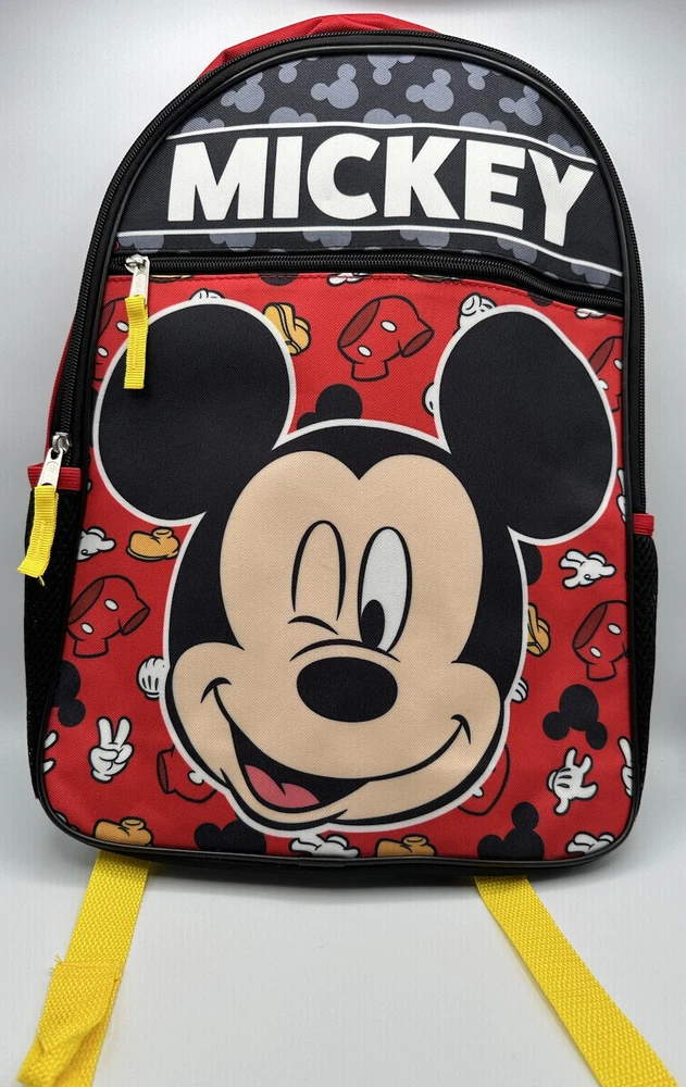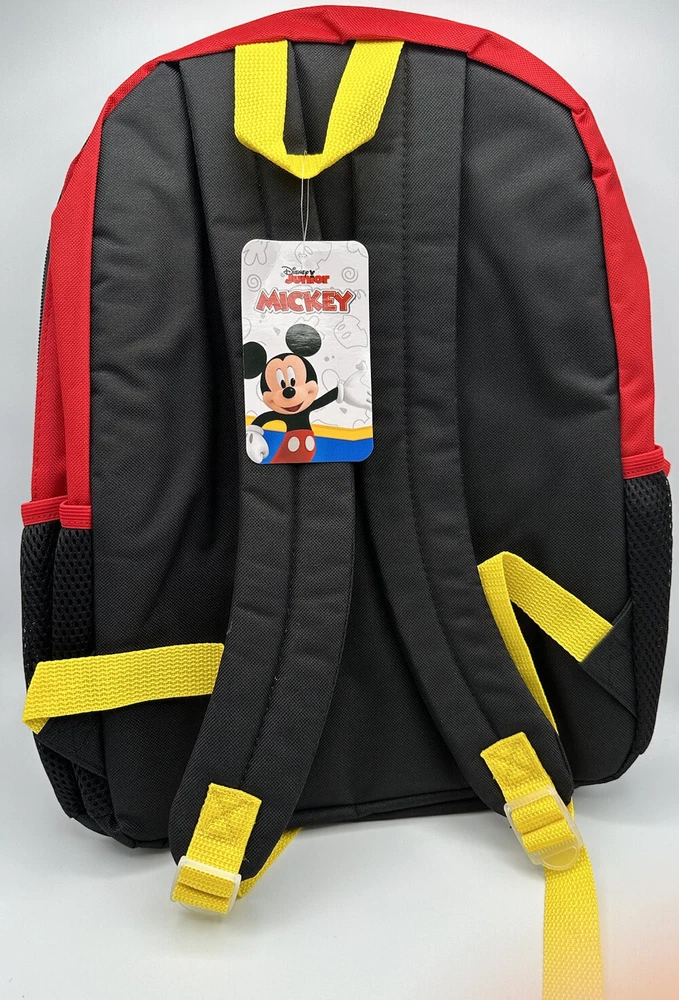 This colorful and spacious backpack features a beloved Disney character, with a fun and playful Mickey Mouse pattern. The bag is made from recycled materials and has adjustable straps for comfortable wear, making it perfect for travel, casual use, parties, or activewear. The bag measures 16 inches in height, 11 inches in width, and 8 inches in depth, with a convenient zipper closure and shoulder strap handle. Ideal for unisex kids, this Disney Junior backpack is brand new with tags and part of the Bioworld product line. Get yours today and show off your love for Mickey!