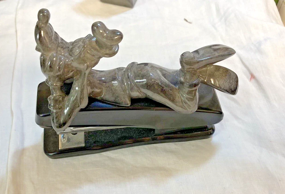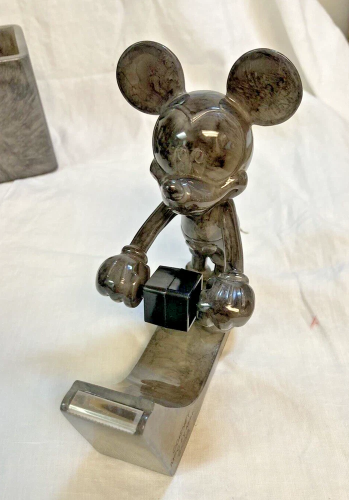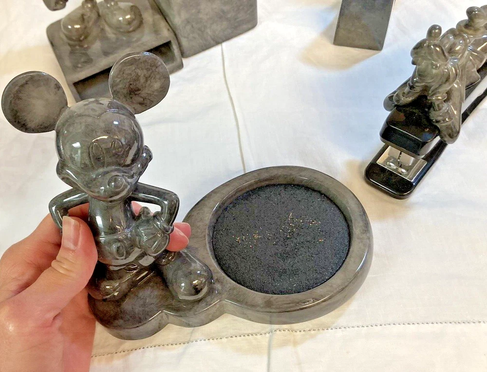 Disney's Mickey Mouse gray faux marble desk set 4 pieces. There is a cup holder, pen and post it holder, tape dispenser and Goofy stapler. All pieces are in very good pre-owned condition and from a smoke free home.