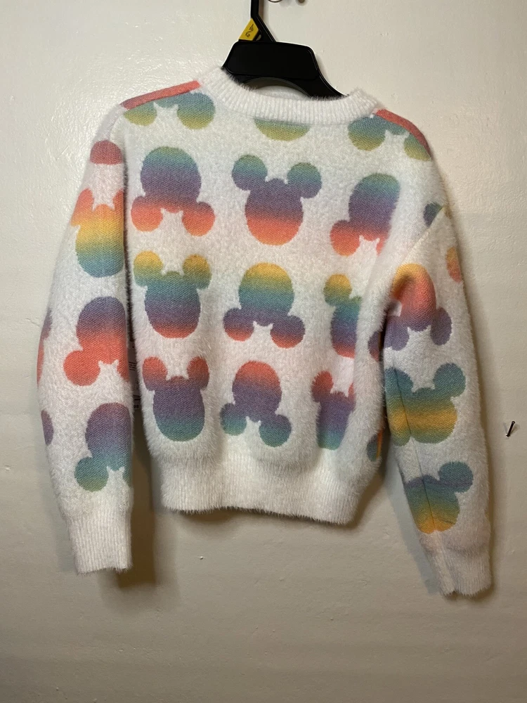 I offer combined shipping. Ask for details before ordering 😊 Thank you! This is a Disney Minnie Mouse sweater in girls size L (10/12), featuring Minnie Mouse ears pattern on a multicolor polyester blend fabric. The sweater has long sleeves, a crew neck, and a pullover closure. It is machine washable and super soft, suitable for casual wear in winter, fall, and spring. The design includes cartoon character themes from Disney's Mickey & Friends.